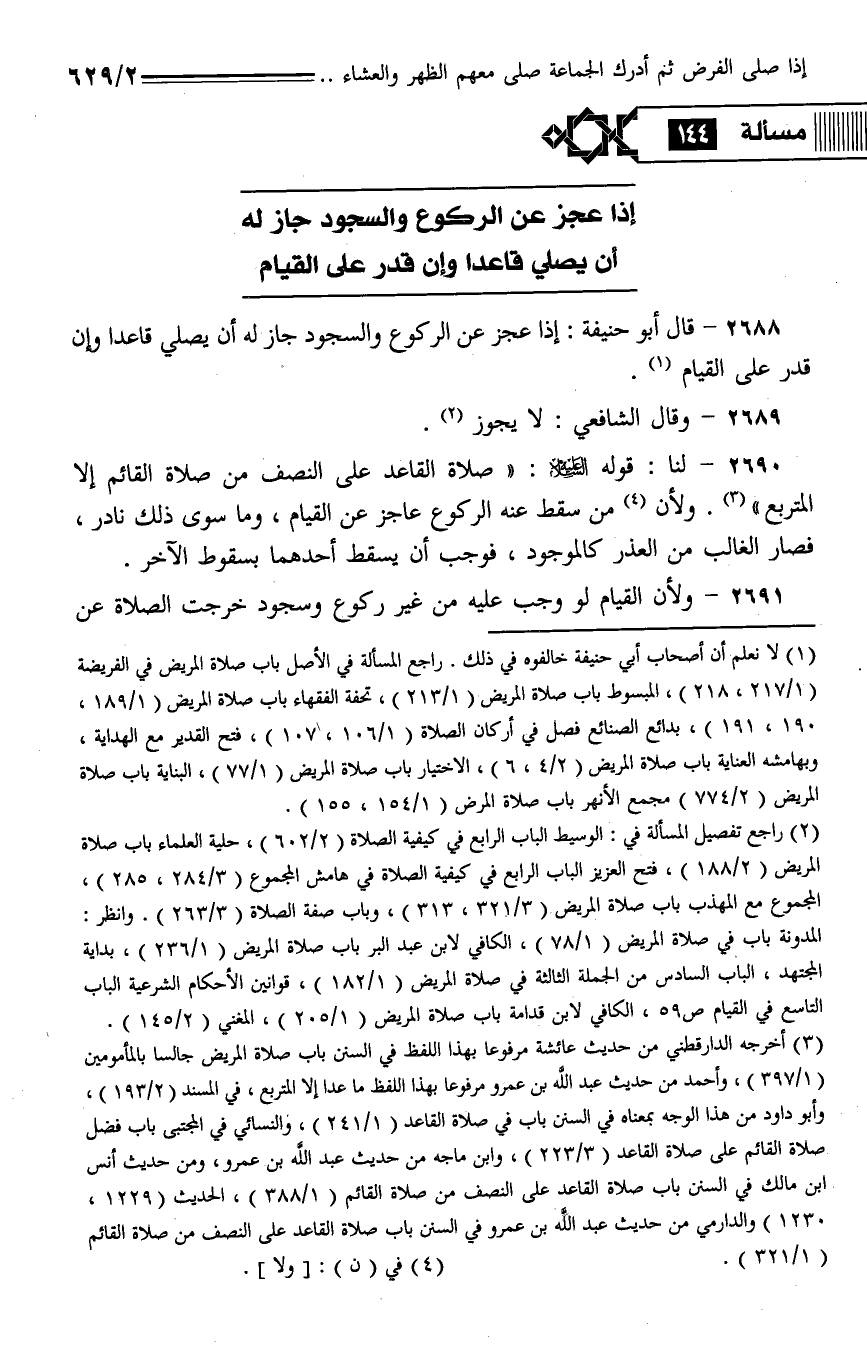 2690 - لنا: قوله: (صلاة القاعد على النصف من صلاة القائم إلا المتربع). ولأن من سقط عنه الركوع عاجز عن القيام، وما سوى ذلك نادر، فصار الغالب من العذر كالموجود، فوجب أن يسقط أحدهما بسقوط الآخر.