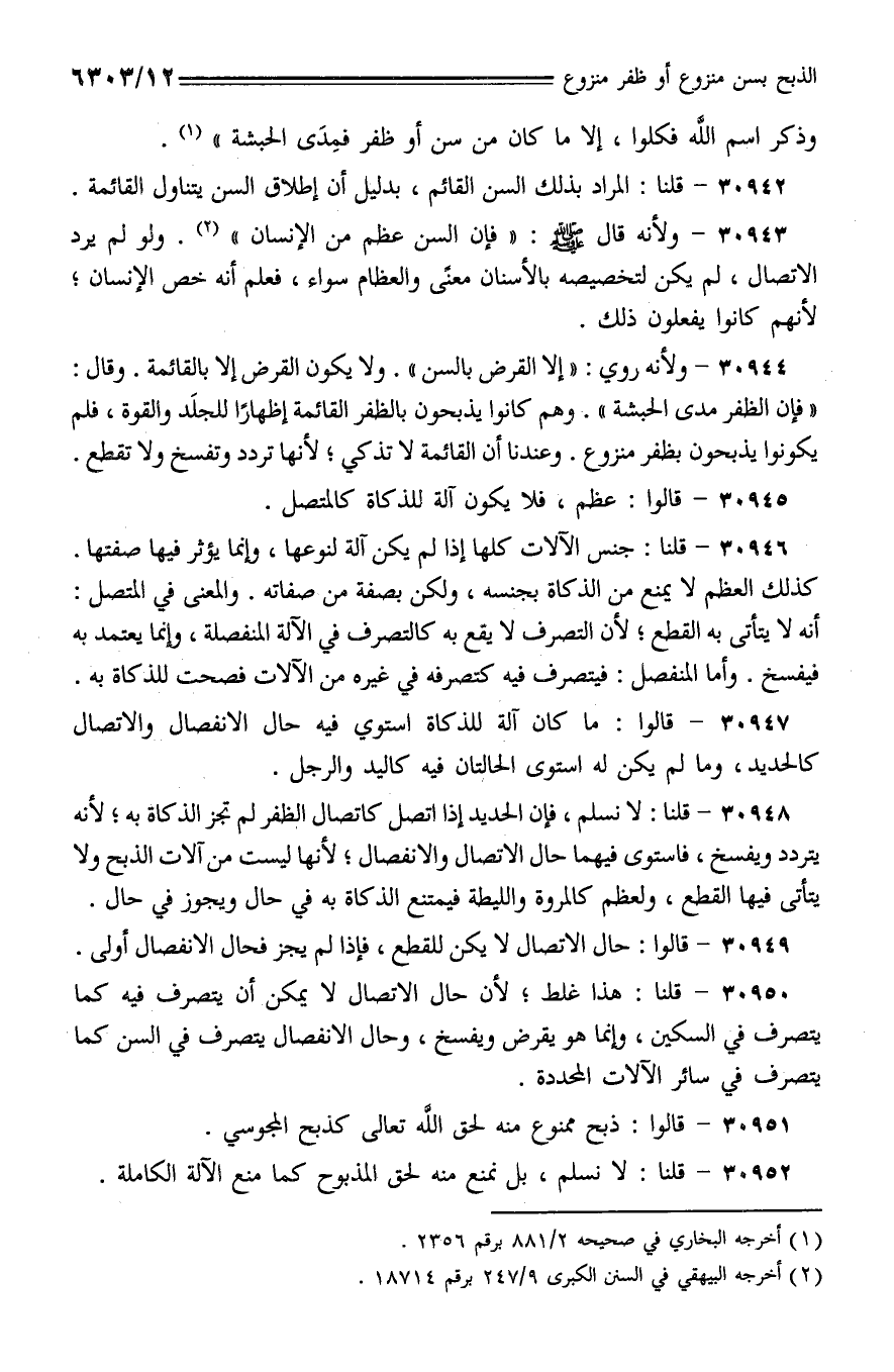 30944 - ولأنه روي: (إلا القرض بالسن). ولا يكون القرض إلا بالقائمة. وقال: (فإن الظفر مدى الحبشة). وهم كانوا يذبحون بالظفر القائمة إظهارًا للجلد والقوة، فلم يكونوا يذبحون بظفر منزوع. وعندنا أن القائمة لا تذكي؛ لأنها تردد وتفسخ ولا تقطع.