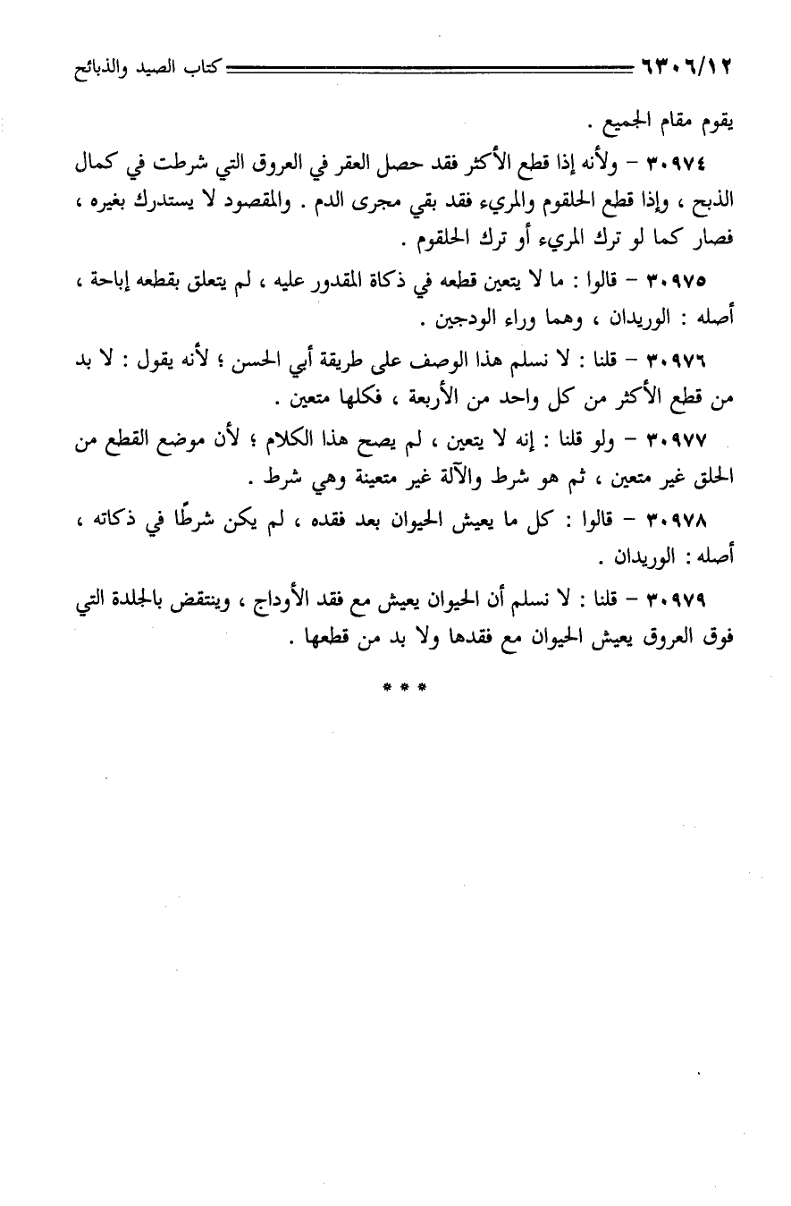 30979 - قلنا: لا نسلم أن الحيوان يعيش مع فقد الأوداج، وينتقض بالجلدة فالتي فوق العروق يعيش الحيوان مع فقدها ولابد من قطعها.