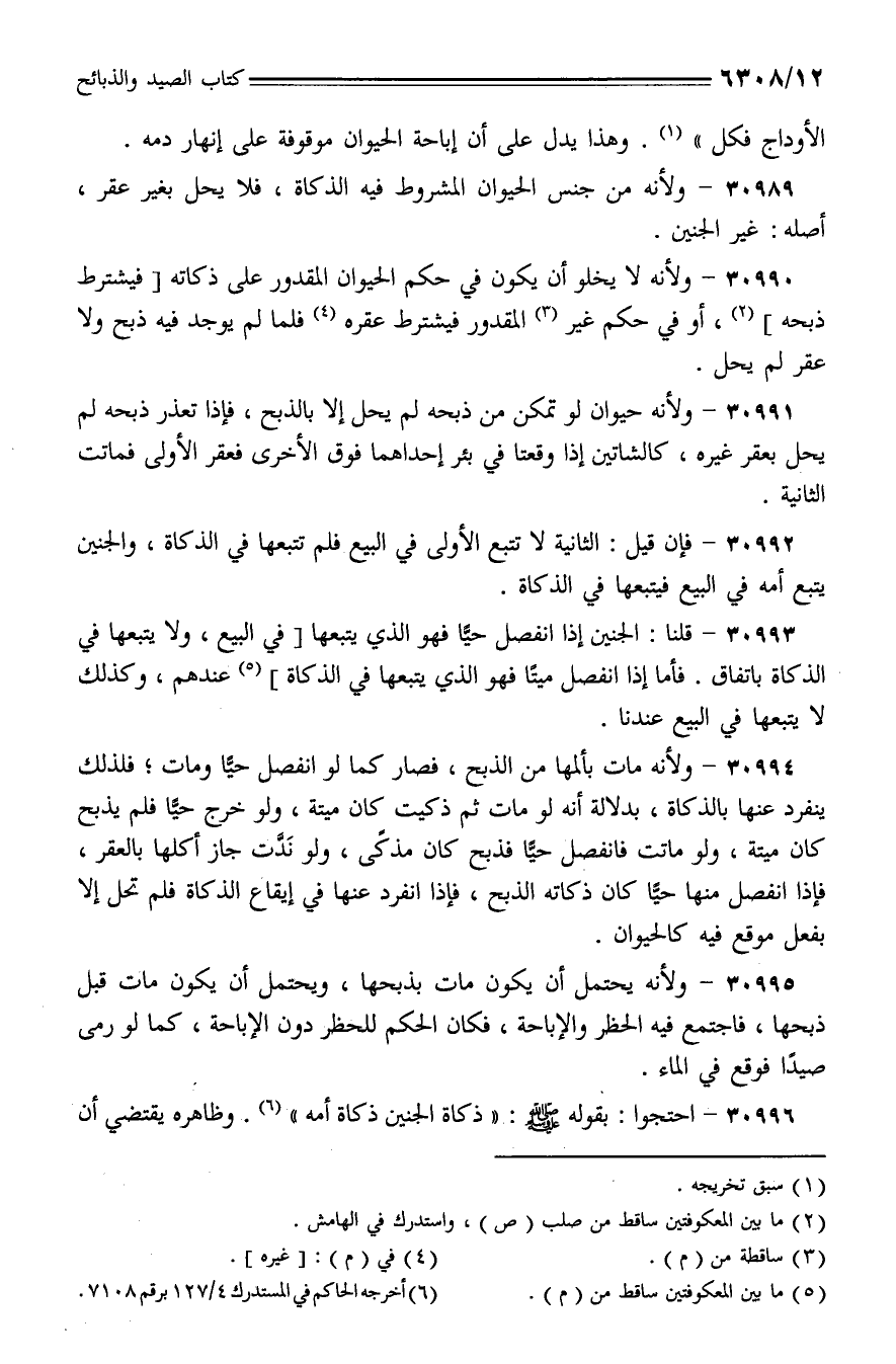 30993 - قلنا: الجنين إذا انفصل حيًا فهو الذي يتبعها [في البيع، ولا يتبعها في الذكاة باتفاق. فأما إذا انفصل ميتًا فهو الذي يتبعها في الذكاة] عندهم، وكذلك لا يتبعها في البيع عندنا.