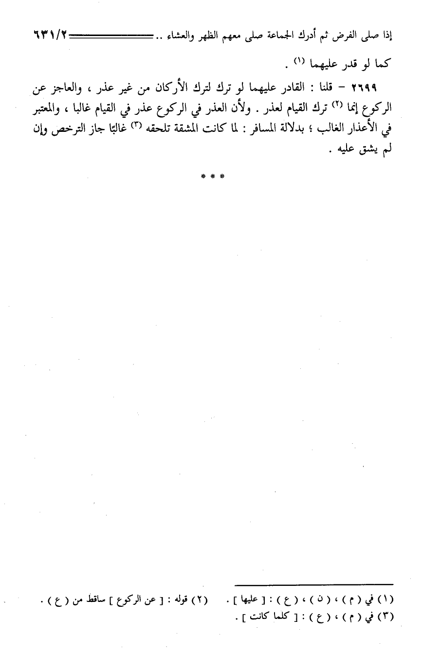 2699 - قلنا: القادر عليهما لو ترك لترك الأركان من غير عذر، والعاجز عن الركوع إنما ترك القيام لعذر. ولأن العذر في الركوع عذر في القيام غالبا، والمعتبر في الأعذار الغالب؛ بدلالة المسافر: لما كانت المشقة تلحقه غالبا جاز الترخص وإن لم يشق عليه.