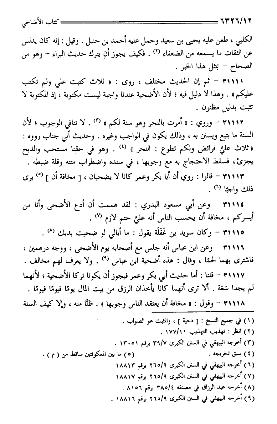 31112 - وروي: (أمرت بالنحر وهو سنة لكم). لا تنافي الوجوب؛ لأن السنة ما يتبع ويستن به، وذلك يكون في الواجب وغيره. وحديث أبي جناب رووه: (ثلاث علي فرائض ولكم تطوع: النحر). وهو في حقنا مستحب والذبح يجزئ، فسقط الاحتجاج به مع وجوبها، في سنده واضطراب متنه وقلة ضبطه.