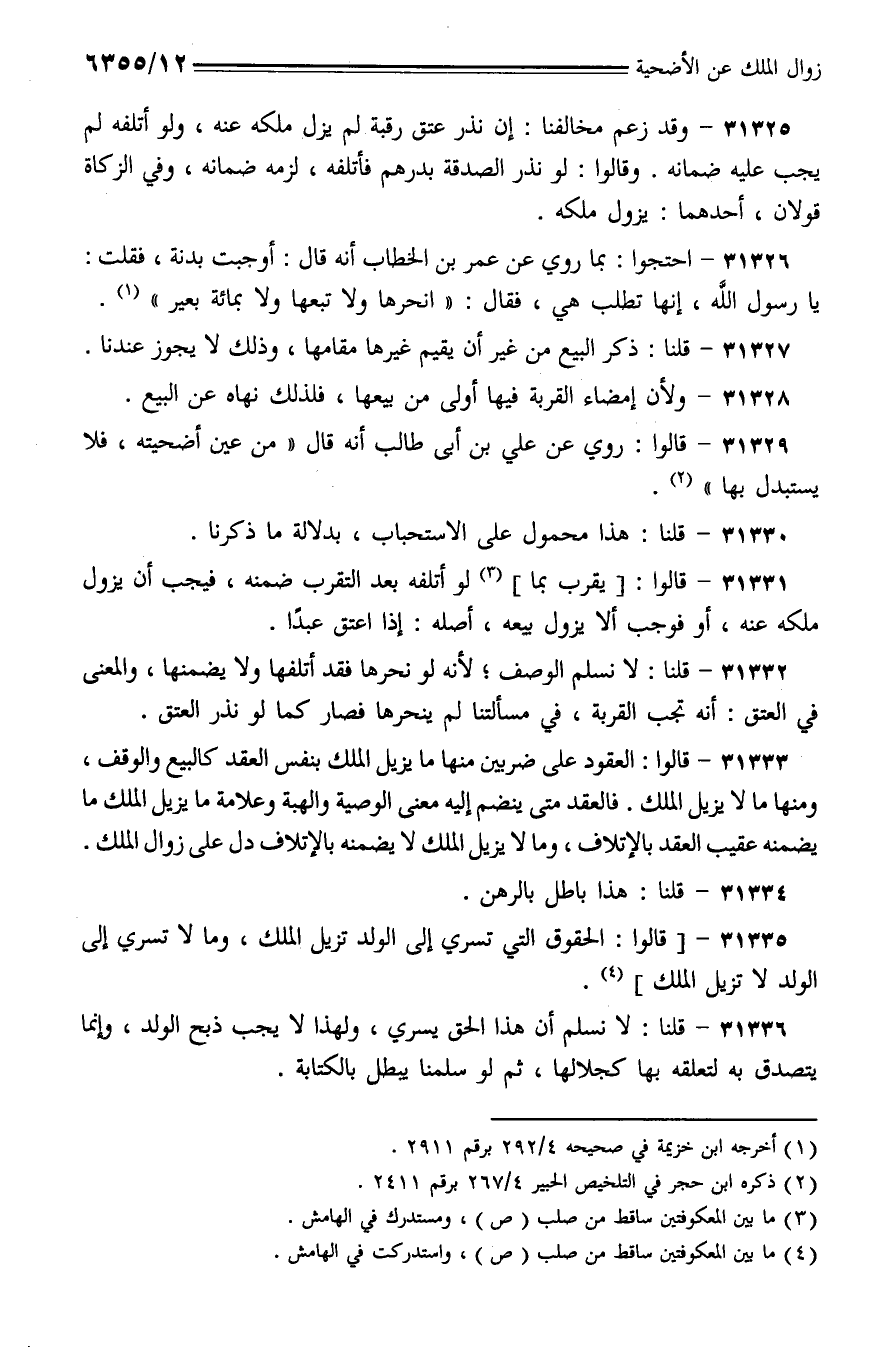 31326 - احتجوا: بما روي عن عمر بن الخطاب أنه قال: أوجبت بدنة، فقلت: يا رسول الله، إنها تطلب هي، فقال: (أنحرها ولا تبعها ولا بمائة بعير).