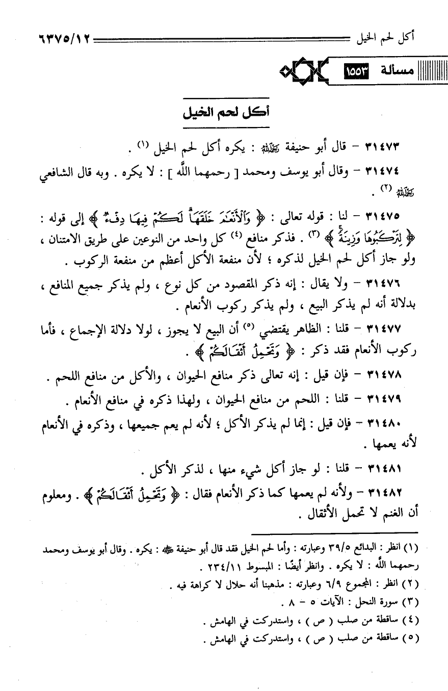 31475 - لنا: قوله تعالى: {والأنعام خلقها لكم فيها دفء}. إلى قوله: {لتركبوها وزينة} فذكر منافع كل واحد من النوعين عل طريق الامتنان، ولو جاز أكل لحم الخيل لذكره؛ لأن منفعة الأكل أعظم من منفعة الركوب.
