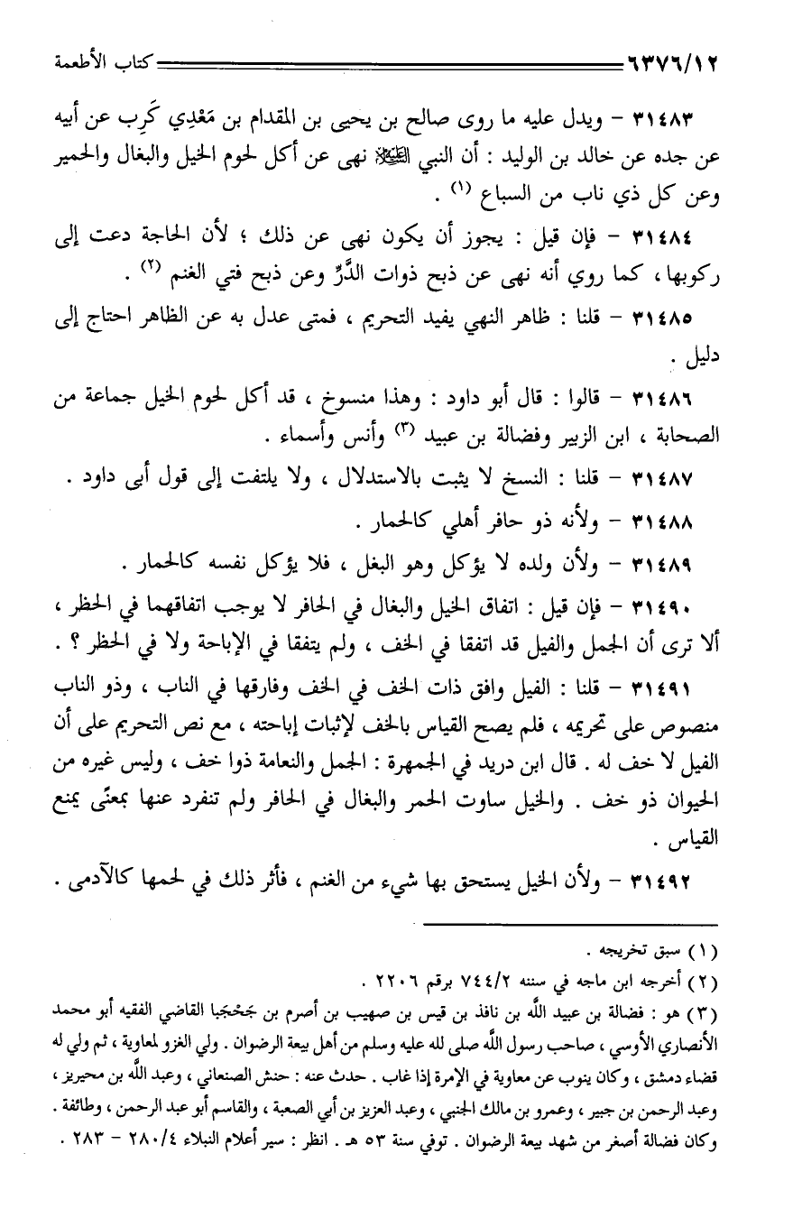 31486 - قالوا: قال أبو داود: وهذا منسوخ، قد أكل لحوم الخيل جماعة من الصحابة، ابن الزير وفضالة بن عبيد وأنس وأسماء.