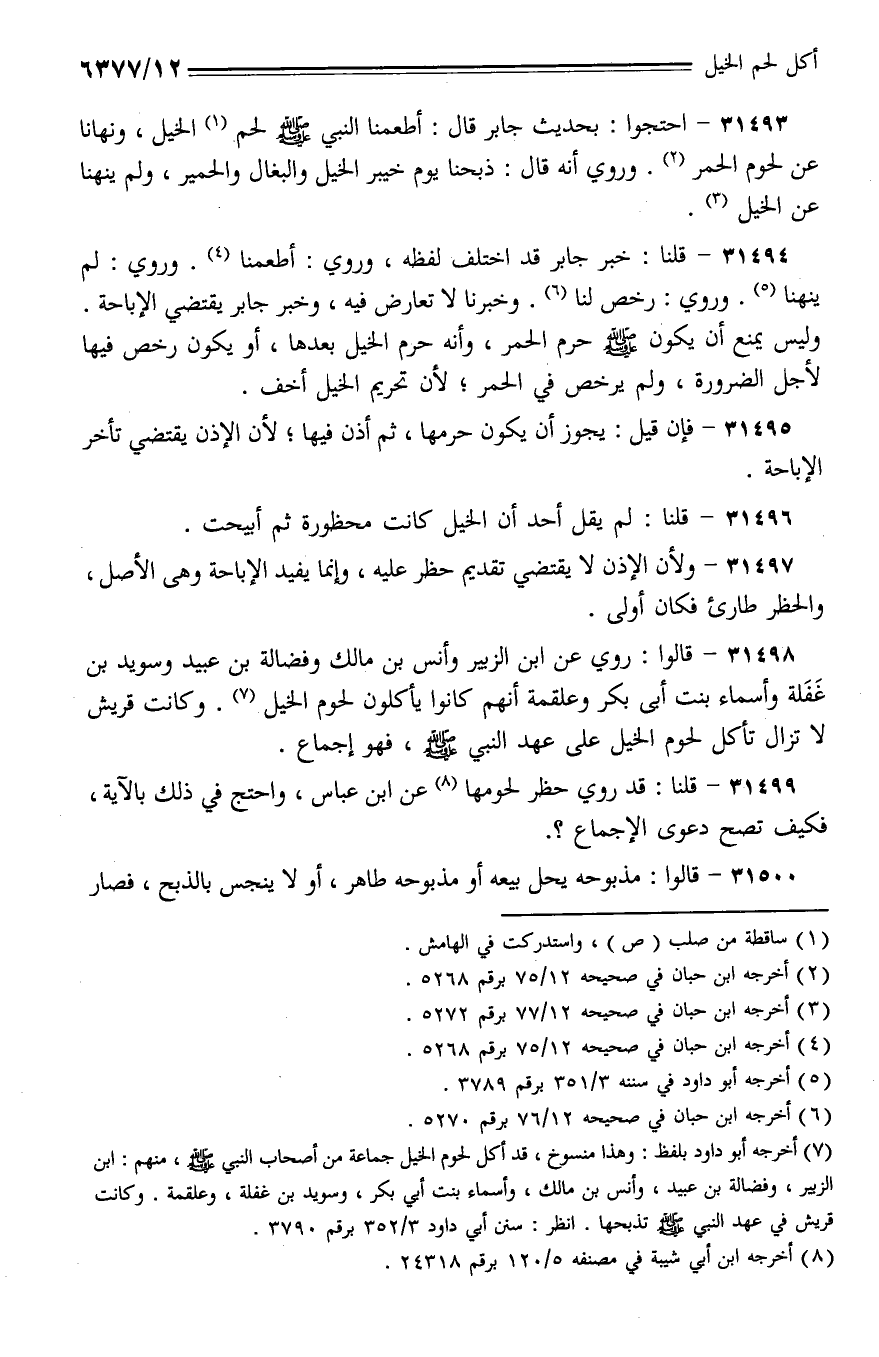 31498 - قالوا: روي عن ابن الزبير وأنس بن مالك وفضالة بن عبيد وسويد بن غفلة وأسماء بنت أبي بكر وعلقمة أنهم كانوا يأكلون لحوم الخيل وكانت قريش لا تزال تأكل لحوم الخيل على عهد النبي - صلى الله عليه وسلم -، فهو إجماع.