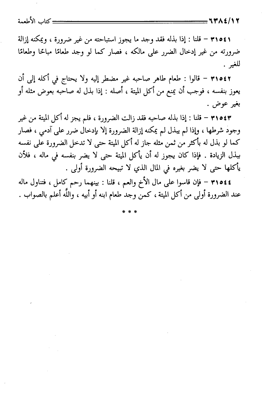 31542 - قالوا: طعام طاهر صاحبه غير مضطر إليه ولا يحتاج ي لحله إلى أن يعوز بنفسه، فوجب أن يمنع من أكل الميتة، أصله: إذا بذل له صاحبه بعوض مثله أو بغير عوض.