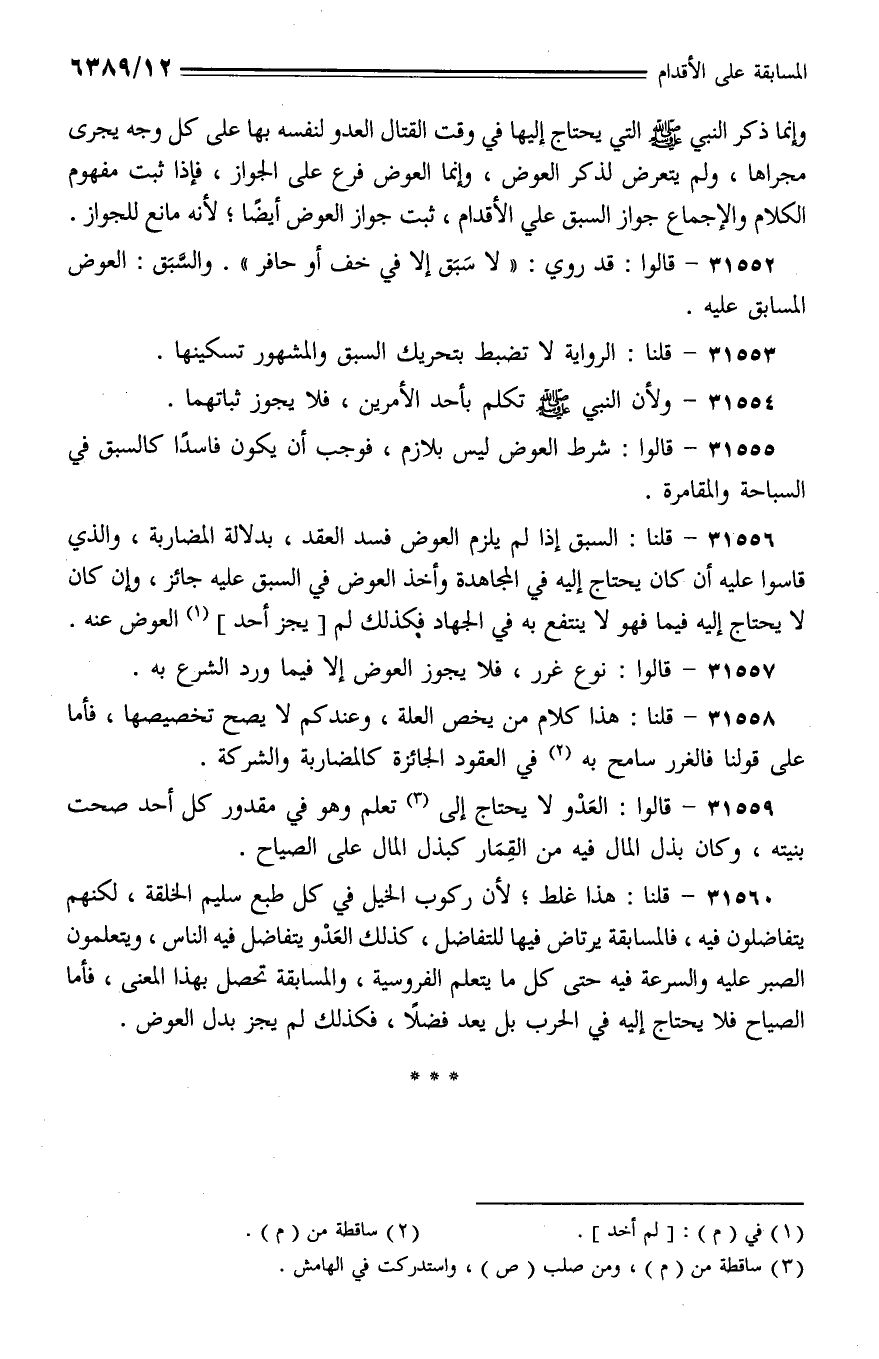 31556 - قلنا: السبق إذا لم يلزم العوض فسد العقد، بدلالة المضاربة، والذي قاسوا عليه أن كان يحتاج إليه في المجاهدة وأخذ العوض في السبق عليه جائز، وان كان لا يحتاج إليه فيما فهو لا ينتفع به ني الجهاد فكذلك لم [يجز أحد] العوض عنه.