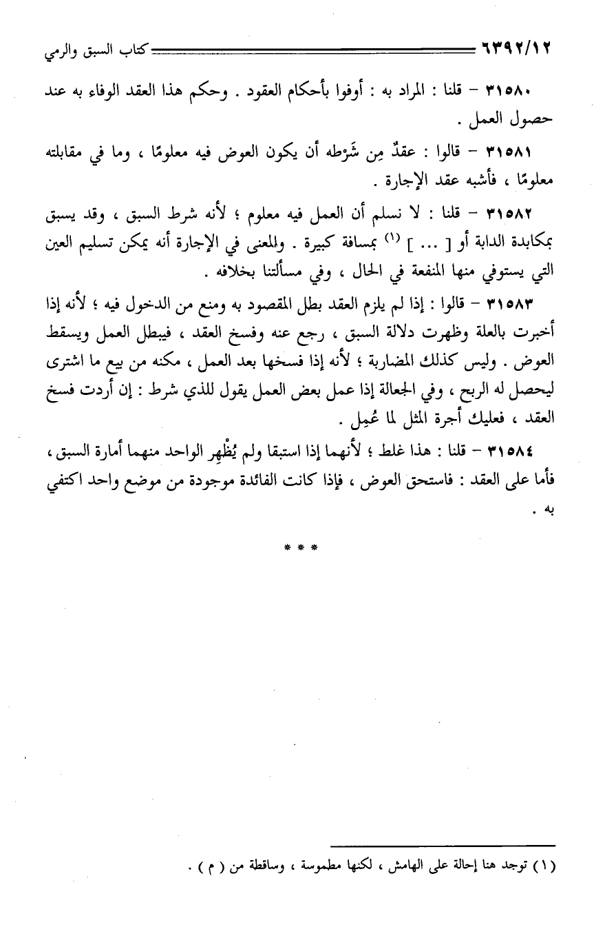 31582 - قلنا: لا نسلم أن العمل فيه معلوم؛ لأنه شرط السبق، وقد يسبق بمكابدة الدابة أو [...] بمسافة كبيرة. والمعنى في الإجارة أنه يمكن تسليم العين التي يستوفي منها المنفعة ي الحال، وفي مسألتنا بخلافه.