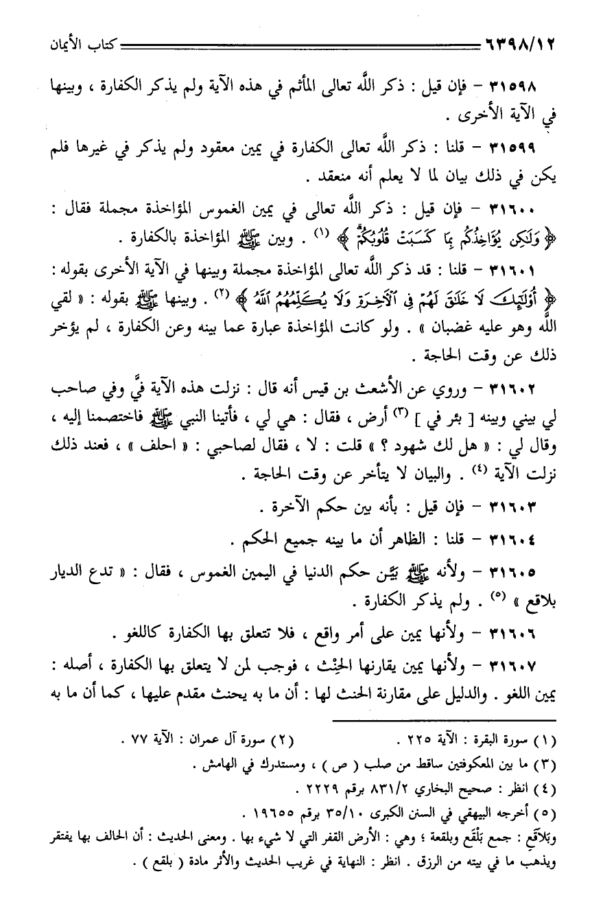 31601 - قلنا: قد ذكر الله تعالى المؤاخذة مجملة وبينها في الآية الأخرى بقوله: {أولئك لا خلق لهم في الآخرة ولا يكلمهم الله}. وبينها - صلى الله عليه وسلم - بقوله: (لقي الله وهو عليه غضبان). ولو كانت المؤاخذة عبارة عما بينه وعن الكفارة، لم يؤخر ذلك عن وقت الحاجة.