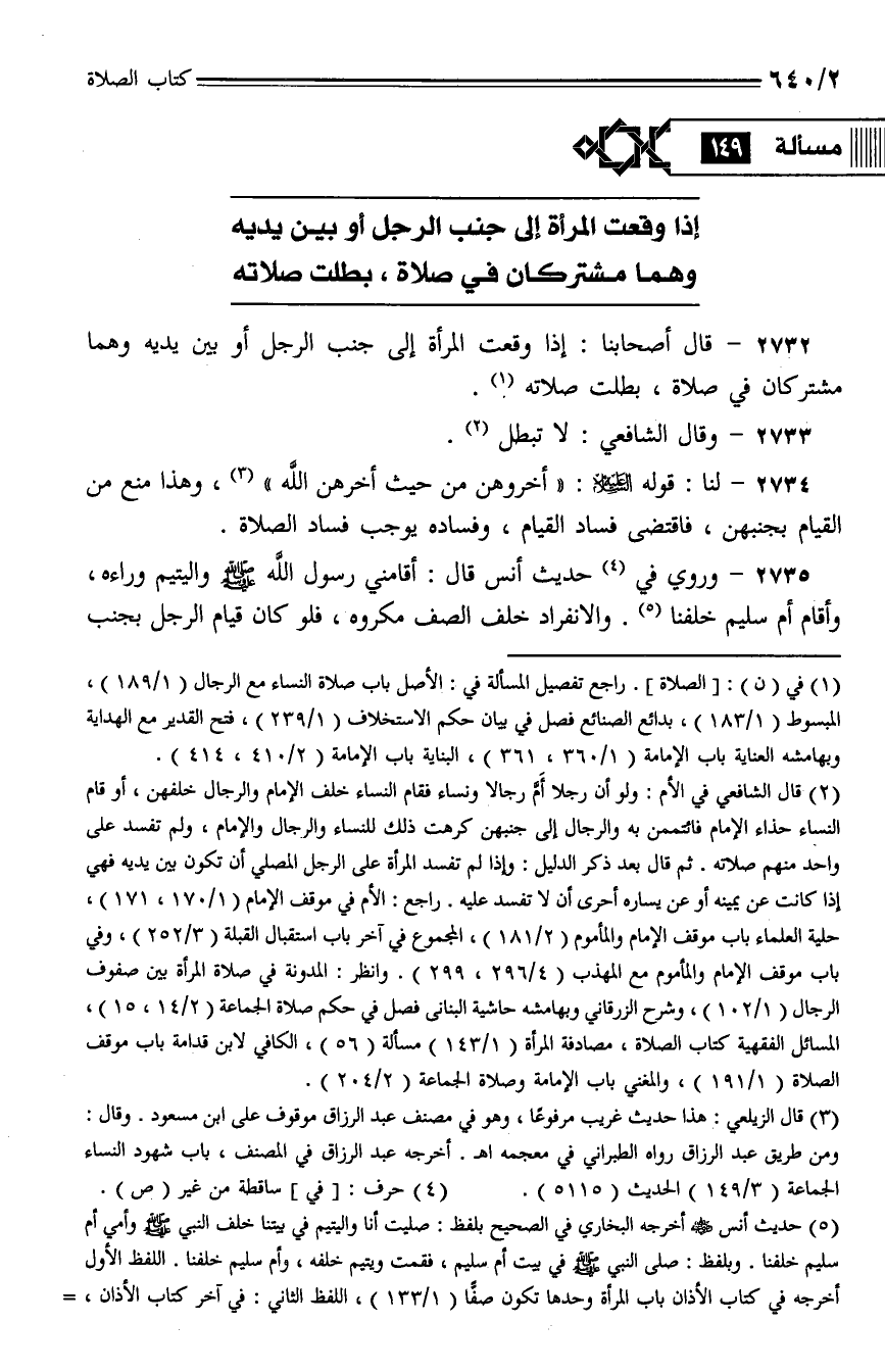 2732 - قال أصحابنا: إذا وقعت المرأة إلى جنب الرجل أو بين يديه وهما مشتركان في صلاة، بطلت صلاته.