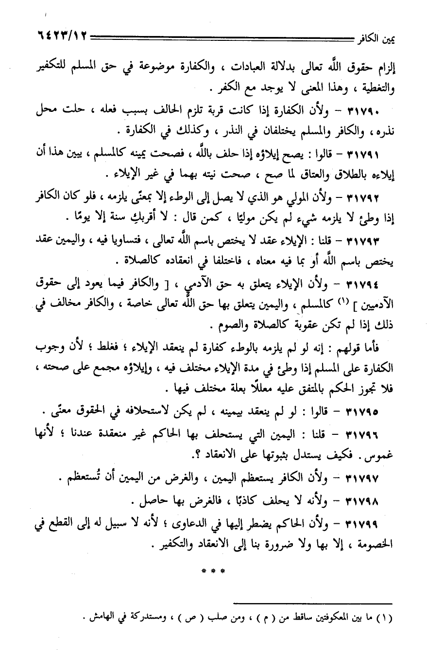 31792 - ولأن المولي هو الذي لا يصل إلى الوطء إلا بمعنى يلزمه، فلو كان الكافر إذا وطئ لا يلزمه شيء لم يكن موليًا، كمن قال: لا أقربك سنة إلا يومًا.