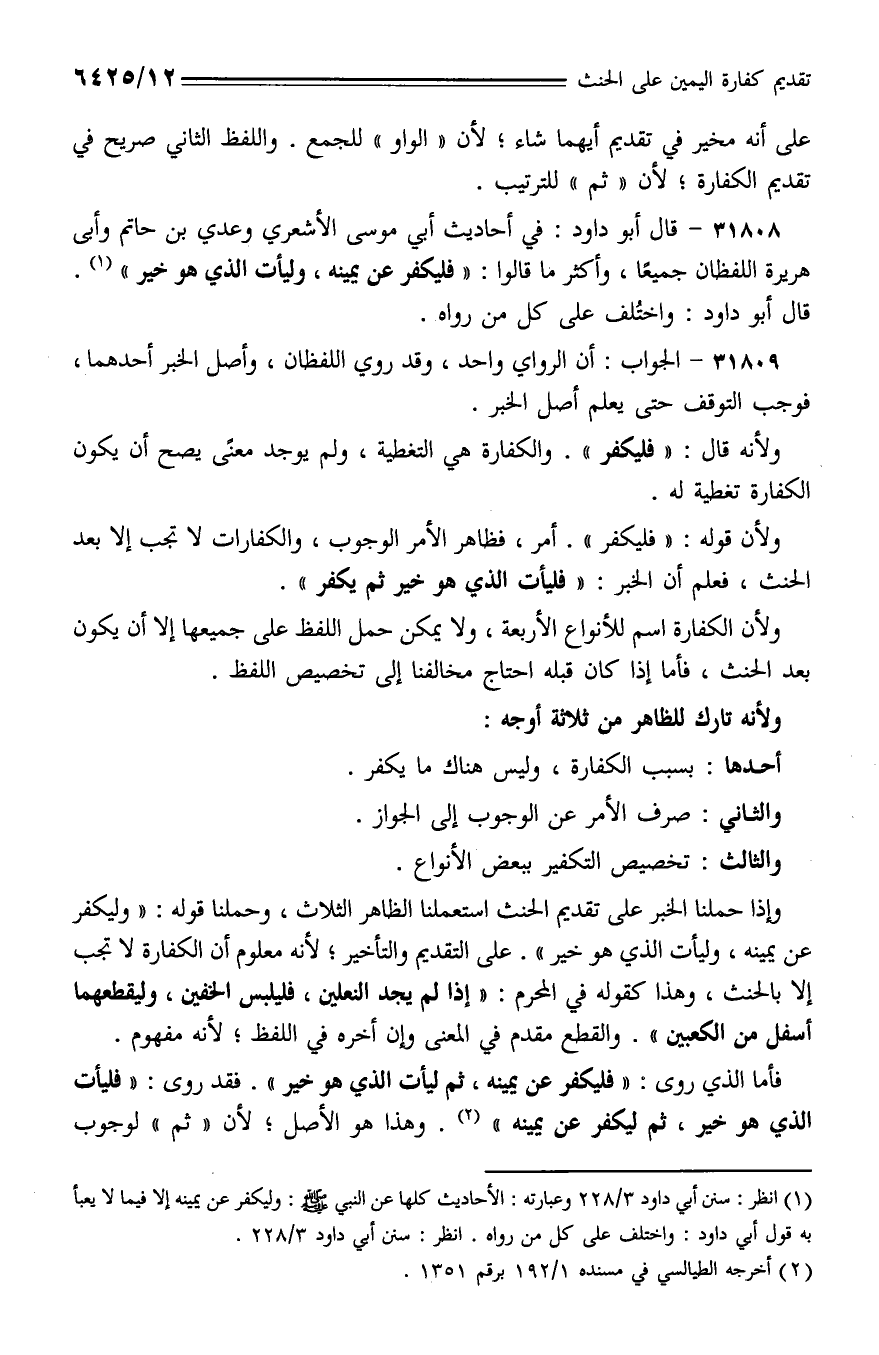 31808 - قال أبو داود: في أحاديث أبي موسى الأشعري وعدي بن حاتم وأبي هريرة اللفظان جميعًا، وأكثر ما قالوا: (فليكفر عن يمينه، وليأت الذي هو خير). قال أبو داود: واختلف على كل من رواه.