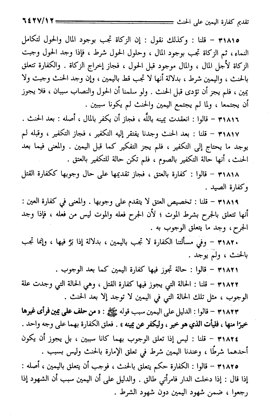 31823 - قالوا: الدليل على اليمين سبب قوله - صلى الله عليه وسلم -: (من حلف على يمين فرأى غيرها خيرًا منها، فليأت الذي هو خير، وليكفر عن يمينه). فعلق الكفارة بهما على وجه واحد.