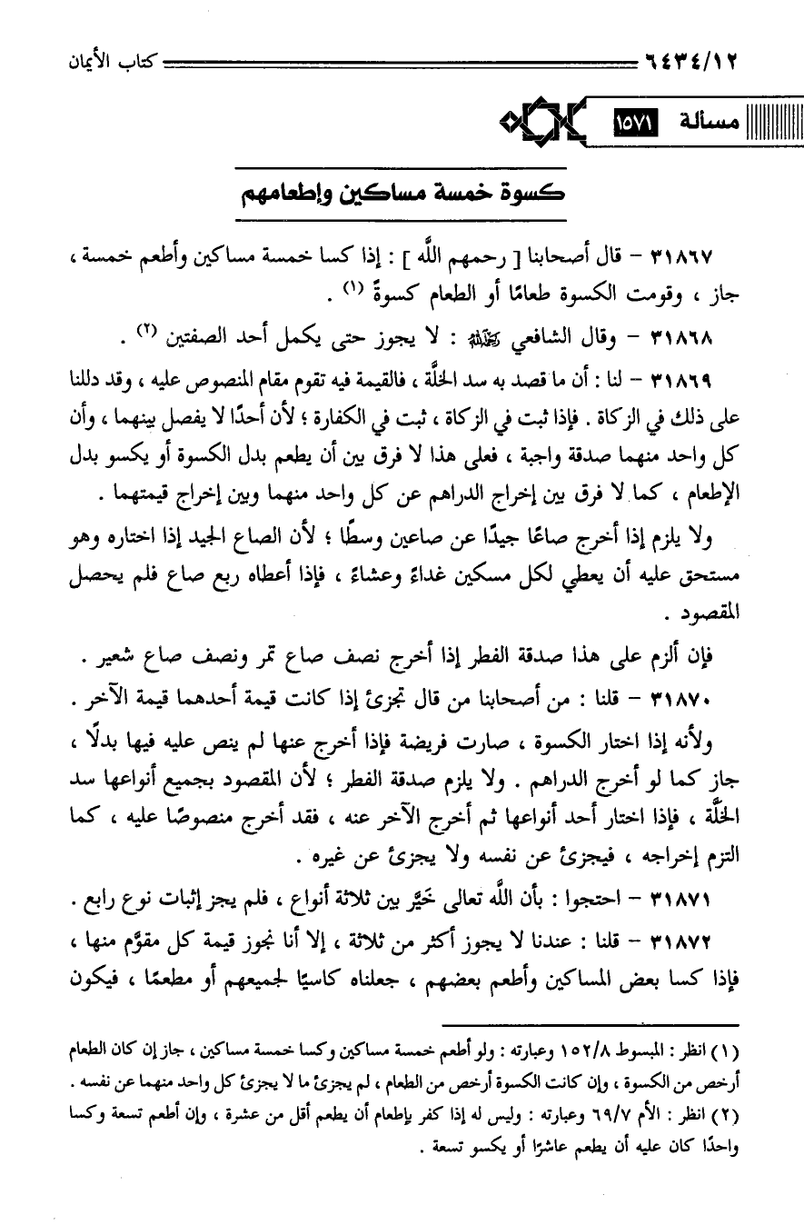 31867 - قال أصحابنا [رحمهم الله]: إذا كسا خمسة مساكين وأطعم خمسة، جاز، وقومت الكسوة طعامًا أو الطعام كسوة.