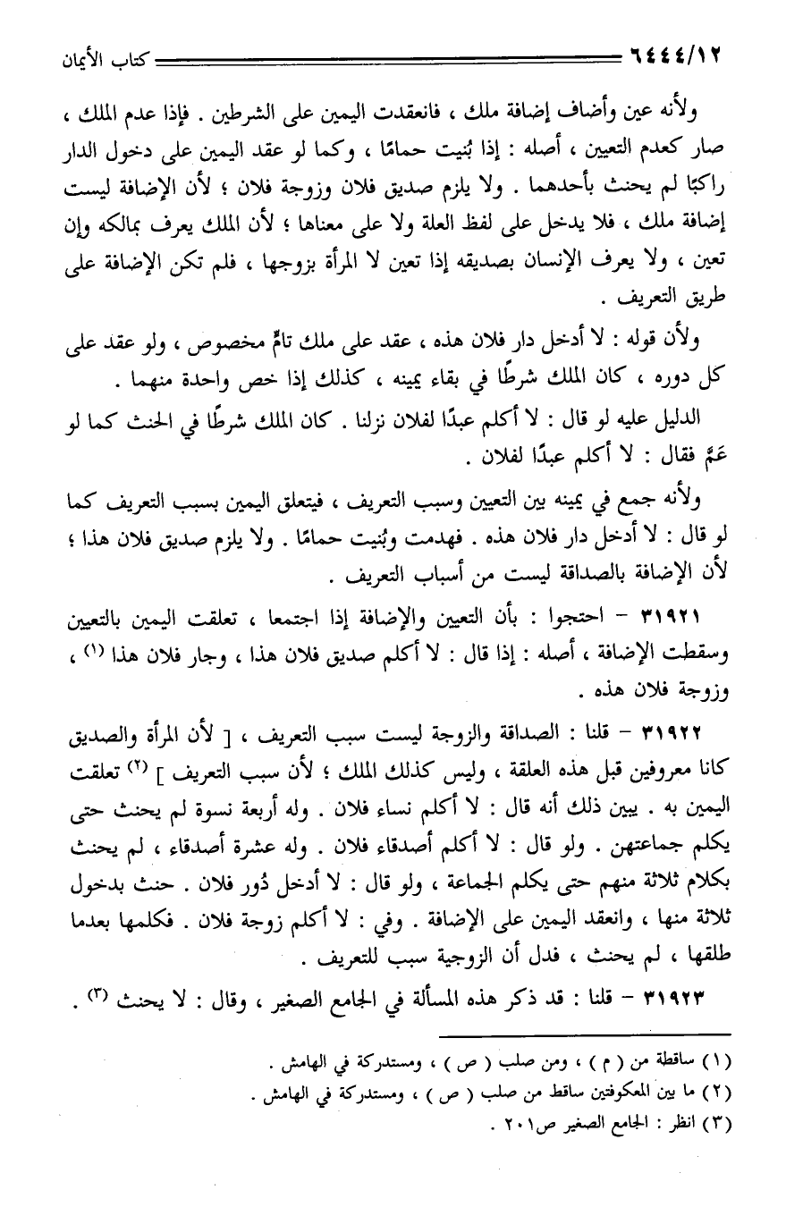 31921 - احتجوا: بأن التعيين والإضافة إذا اجتمعا، تعلقت اليمين بالتعيين وسقطت الإضافة، أصله: إذا قال: لا أكلم صديق فلان هذا، وجار فلان هذا، وزوجة فلان هذه.