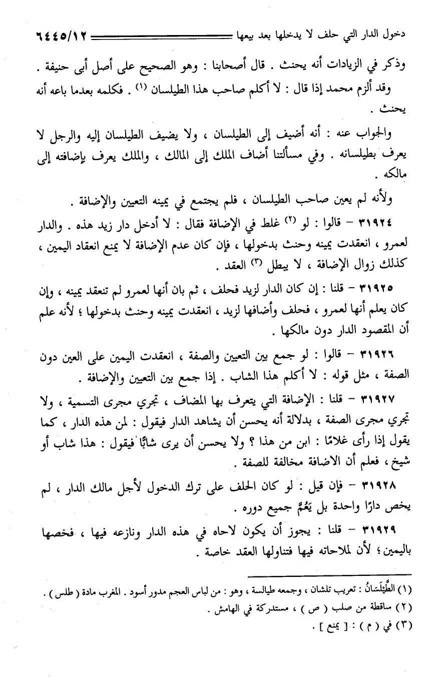 31928 - فإن قيل: لو كان الحلف على ترك الدخول لأجل مالك الدار، لم يخص دارًا واحدة بل يعم جميع دوره.