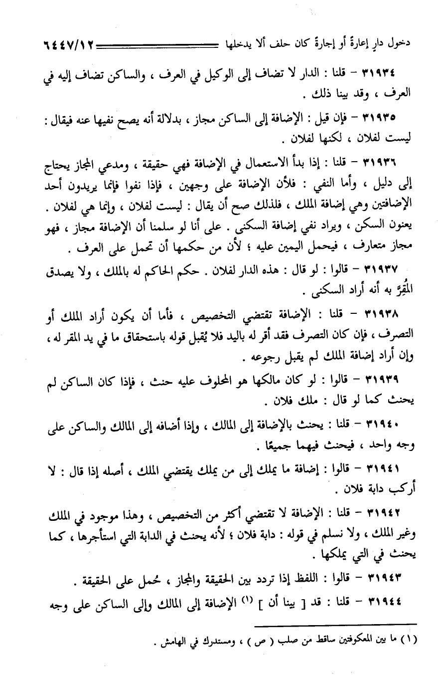 31941 - قالوا: إضافة ما يملك إلى من يملك يقتضي الملك، أصله إذا قال: لا أركب دابة فلان.