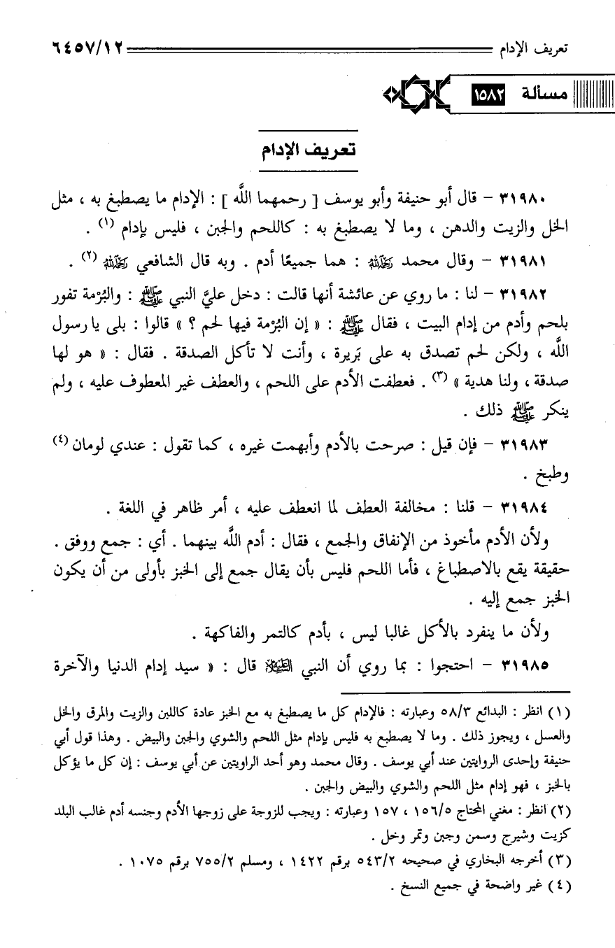 31980 - قال أبو حنيفة وأبو يوسف [رحمهما الله]: الإدام ما يصطبغ به، مثل الخل والزيت والدهن، وما لا يصطبغ به: كاللحم والجبن، فليس بإدام.