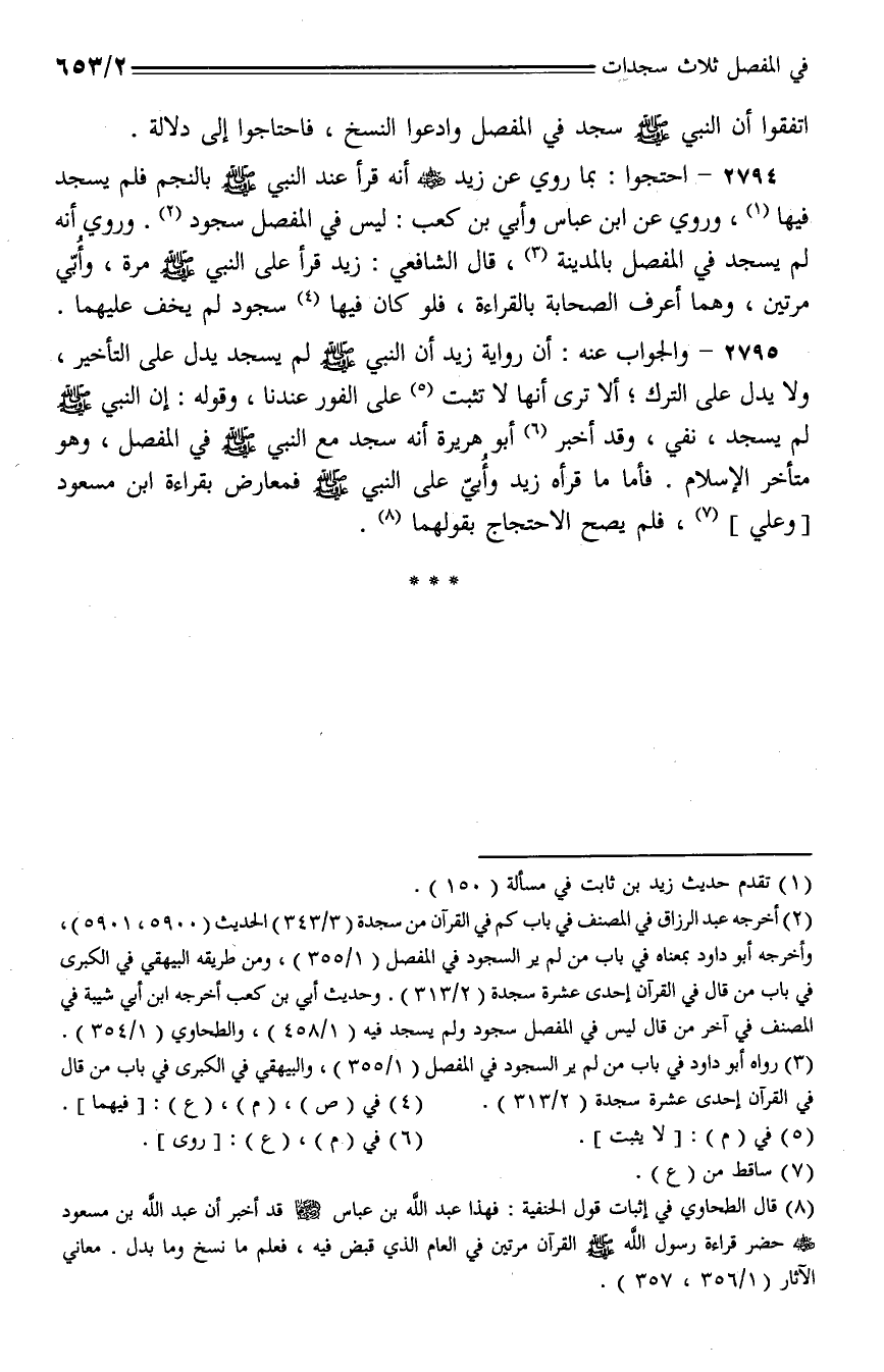 2795 - والجواب عنه: أن رواية زيد أن النبي - صلى الله عليه وسلم - لم يسجد يدل على التأخير، ولا يدل على الترك؛ ألا ترى أنها لا تثبت على الفور عندنا، وقوله: إن النبي - صلى الله عليه وسلم - لم يسجدن نفي، وقد أخبر أبو هريرة أنه سجد مع النبي - صلى الله عليه وسلم - في المفصل، وهو متأخر الإسلام. فأما ما قرأه زيد وأبي على النبي - صلى الله عليه وسلم - فمعارض بقراءة ابن مسعود [وعلي]، فلم يصح الاحتجاج بقولهما.