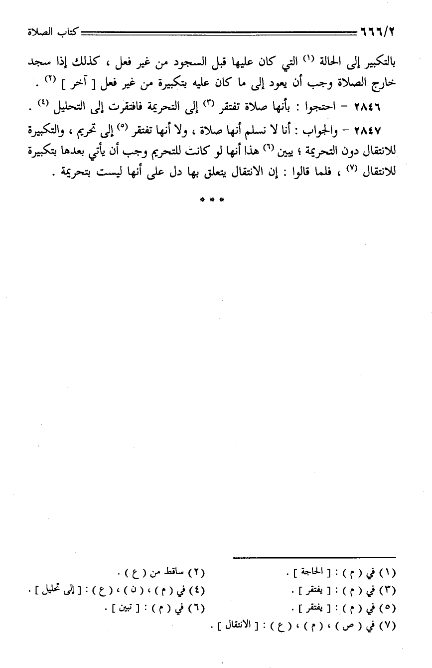 2847 - والجواب: أنا لا نسلم أنها صلاة، ولا أنها تفتقر إلى تحريم، والتكبيرة للانتقال دون التحريمة؛ يبين هذا أنها لو كانت للتحريم وجب أن يأتي بعدها بتكبيرة للانتقال، فلما قالوا: إن الانتقال يتعلق بها دل على أنها ليست بتحريمة.
