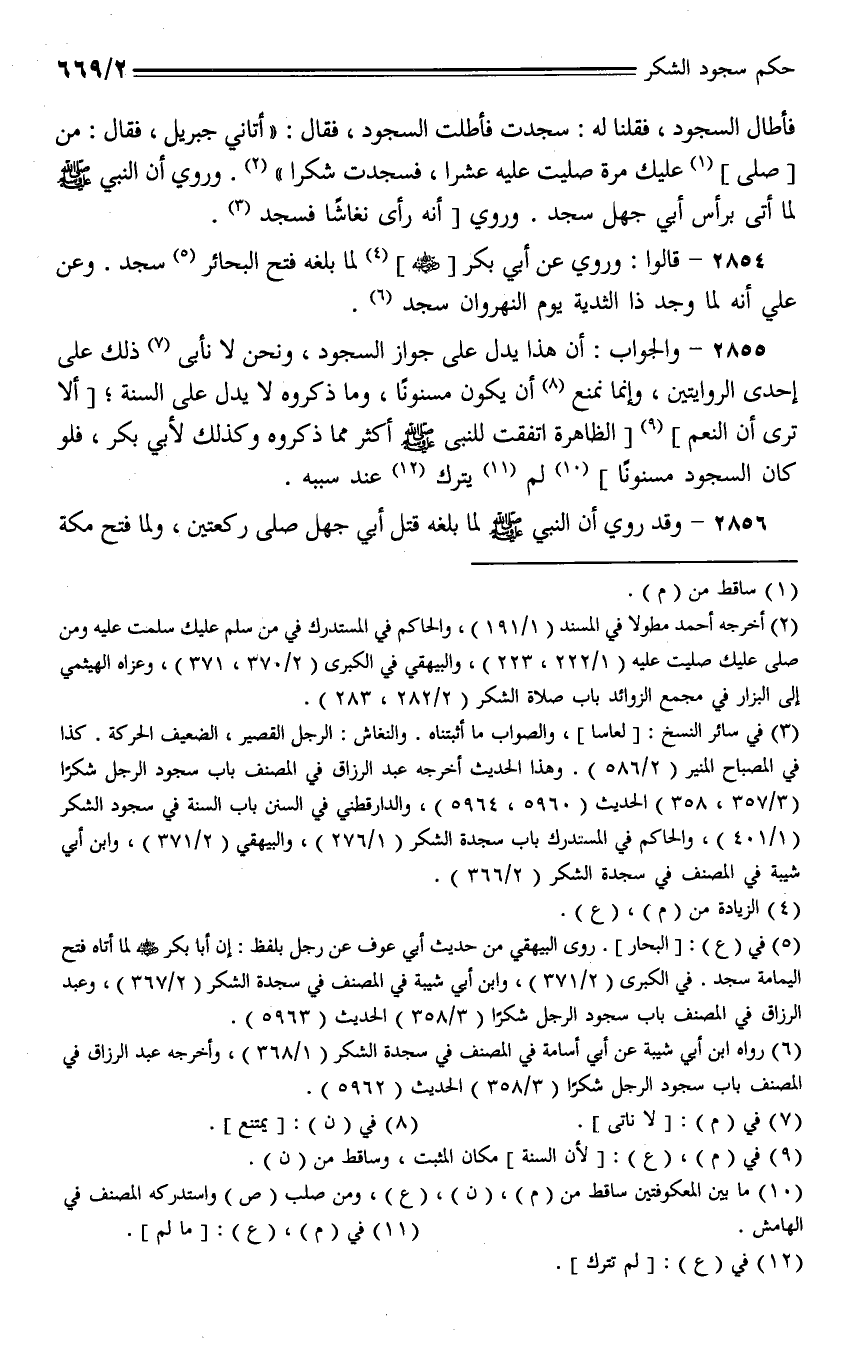 2854 - قالوا: وروي عن أبي بكر [- رضي الله عنه -] لما بلغه فتح البحائر سجد. وعن علي أنه لما وجد ذا الثدية يوم النهروان سجد.