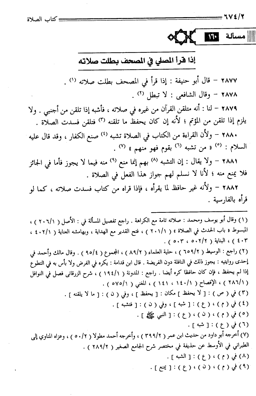 2880 - ولأن القراءة من الكتاب في الصلاة تشبه صنع الكفار، وقد قال عليه السلام: (من تشبه بقوم فهو منهم).