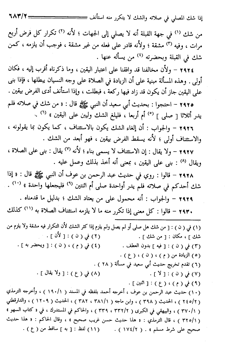 2925 - احتجوا: بحديث أبي سعيد أن النبي - صلى الله عليه وسلم - قال: (من شك في صلاته فلم يدر أثلاثا [صلى] أم أربعا، فليلغ الشك وليبن على اليقين).