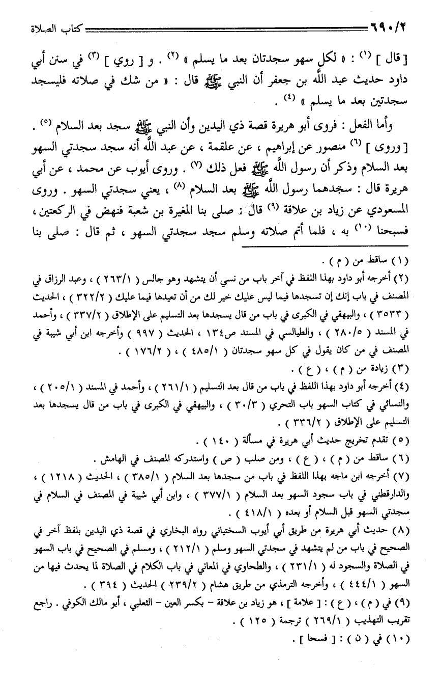 [قال]: (لكل سهو سجدتان بعدما يسلم). و [روي] في سنن أبي داود حديث عبد الله بن جعفر أن النبي - صلى الله عليه وسلم - قال: (من شك في صلاته فليسجد سجدتين بعد ما يسلم).