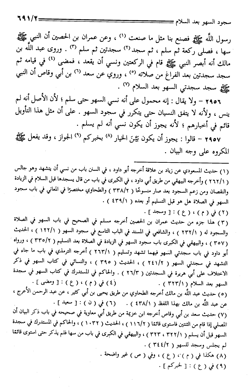 رسول الله - صلى الله عليه وسلم - فصنع بنا مثل ما صنعت، وعن عمران بن الحصين أن النبي - صلى الله عليه وسلم - سها، فصلى ركعة ثم سلم، ثم سجد سجدتين ثم سلم. وروى عبد الله بن مالك أنه أبصر النبي - صلى الله عليه وسلم - قام في الركعتين ونسى أن يقعد، فمضى في قيامه ثم سجد سجدتين بعد الفراغ من صلاته، وروي عن سعد بن أبي وقاص أن النبي - صلى الله عليه وسلم - سجد سجدتي السهو بعد السلام.