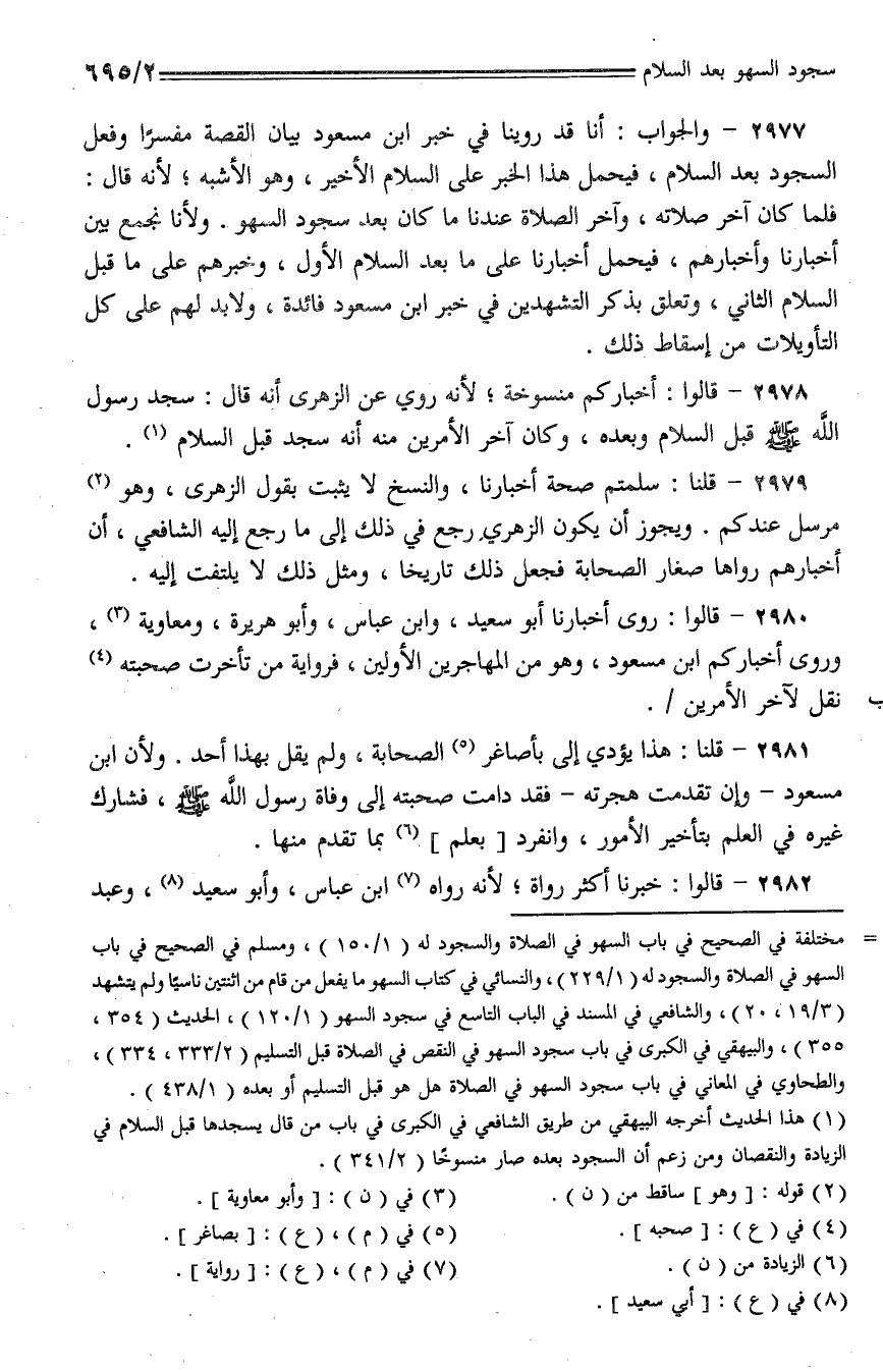 2978 - قالوا: أخباركم منسوخة؛ لأنه روي عن الزهري أنه قال: سجد رسول الله - صلى الله عليه وسلم - قبل السلام وبعده، وكان آخر الأمرين منه أنه سجد قبل السلام.