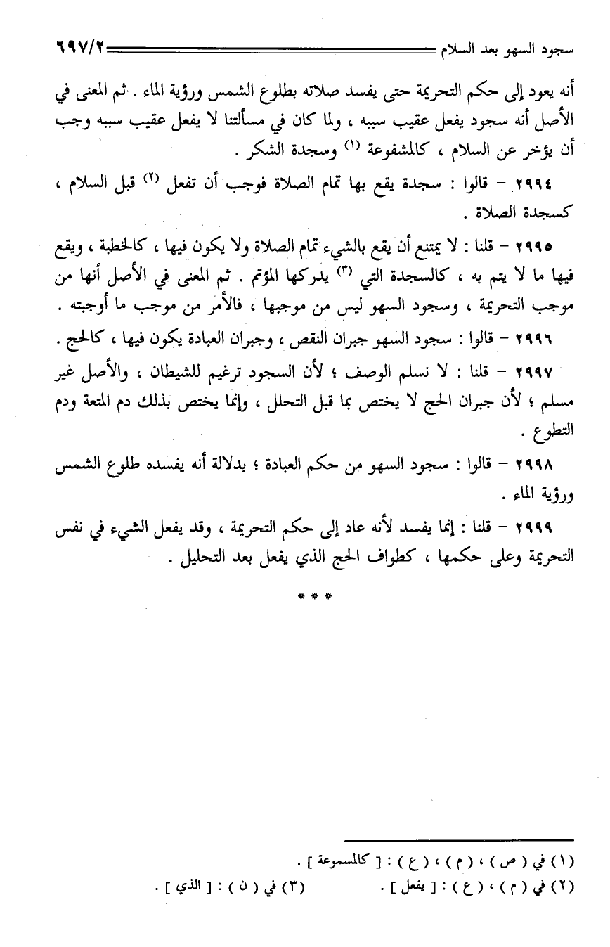 2998 - قالوا: سجود السهو من حكم العبادة؛ بدلالة أنه يفسده طلوع الشمس ورؤية الماء.