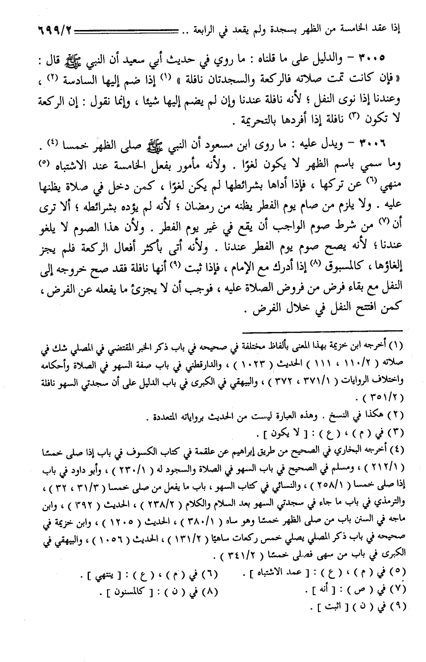 3006 - ويدل عليه: ما روى ابن مسعود أن النبي - صلى الله عليه وسلم - صلى الظهر خمسا. وما سمي باسم الظهر لا يكون لغوا. ولأنه مأمور بفعل الخامسة عند الاشتباه منهي عن تركها، فإذا أداها بشرائطها لم يكن لغوا، كمن دخل في صلاة يظنها عليه. ولا يلزم من صام يوم الفطر يظنه من رمضان؛ لأنه لم يؤده بشرائطه؛ ألا ترى أن من شرط صوم الواجب أن يقع في غير يوم الفطر. ولأن هذا الصوم لا يلغو عندنا؛ لأنه يصح صوم يوم الفطر عندنا. ولأنه أتى بأكثر أفعال الركعة فلم يجز إلغاؤها، كالمسبوق إذا أدرك مع الإمام، فإذا ثبت أنها نافلة فقد صح خروجه إلى النقل مع بقاء فرض من فروض الصلاة عليه، فوجب أن لا يجزئ ما يفعله عن الفرض، كمن افتتح النقل في خلال الفرض.