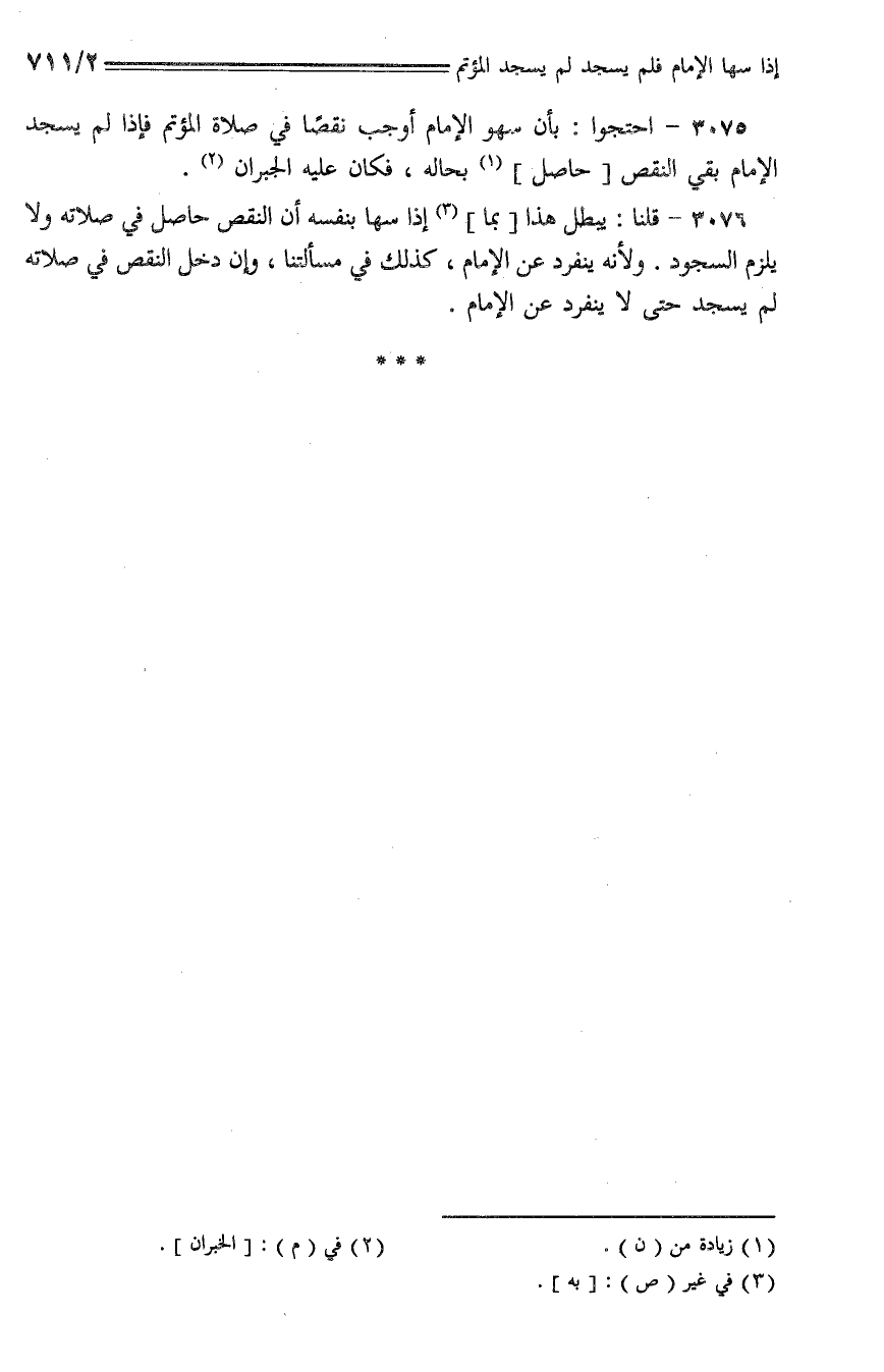 3075 - احتجوا: بأن سهو الإمام أوجب نقصا في صلاة المؤتم فإذا لم يسجد الإمام بقي النقص [حاصل] بحاله، فكان عليه الجبران.