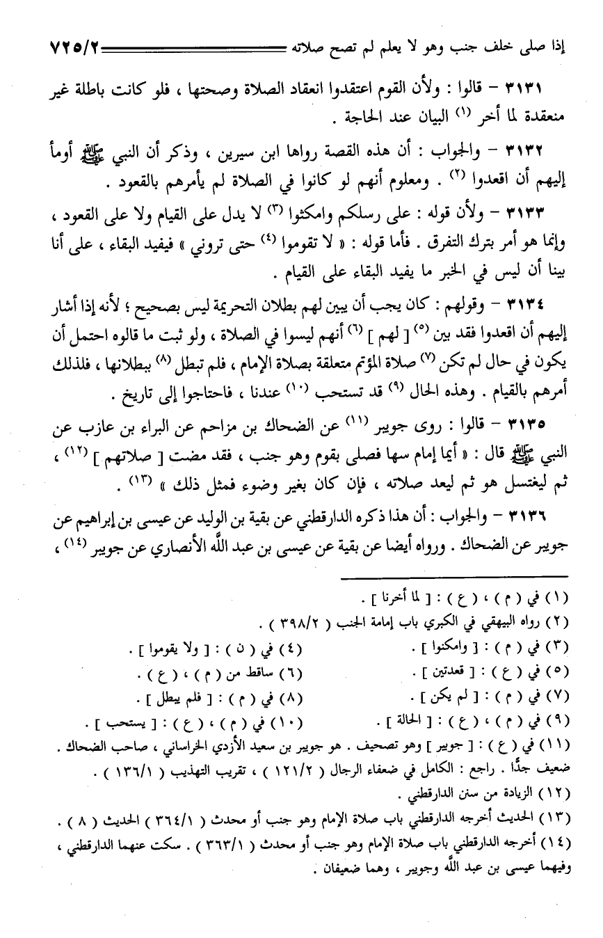 3135 - قالوا: روى جويبر عن الضحاك بين مزاحم عن البراء بن عازب عن النبي - صلى الله عليه وسلم - قال: "إيما إمام سها فصلى بقوم وهو جنب، فقد مضت [صلاتهم]، ثم ليغتسل هو ثم ليعد صلاته، فإن كان بغير وضوء فمثل ذلك".