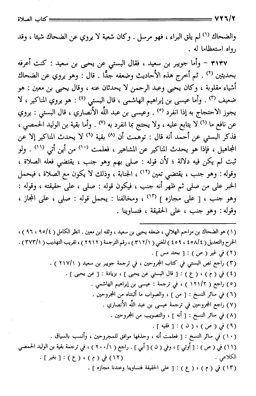 3137 - وأما جويبر بن سعيد، فقال البستي عن يحيى بن سعيد: كنت أعرفه بحديثين. ثم أخرج هذه الأحاديث وضعفه جدا. قال: وهو يروي عن الضحاك أشياء مقلوبة، وكان يحيى وعبد الرحمن لا يحدثان عنه، وقال يحيى بن معين: هو ضعيف. وأما عيسى بن إبراهيم الهاشمي، قال البستي: هو يروي المناكير، لا يجوز الاحتجاج به انفرد. وعيسى بن عبد الله الأنصاري، قال البستي: يروي عن نافع ما لا يتابع عليه، ولا يحتج بما انفرد به. وأما بقية بن الوليد الحمصي، فذكر البستي عن أحمد أنه قال: توهمت أن بقية لا يحدث المناكير إلا عن المجاهيل، فإذا هو يحدث المناكير عن المشاهير، من أين أتي. ولو ثبت لم يكن فيه دلالة؛ لأن قوله: صلى بهم وهو جنب، يقتضي فعله الصلاة, وقوله: وهو جنب، يقتضي تعين، الجنابة، وذلك لا يكون مع الصلاة، فيحمل الخبر على من صلى ثم ظهر انه جنب، فيكون قوله: صلى، على حقيقته، وقوله: وهو جنب، [على مجازه]، ومخالفنا: يحمل قوله: صلى، على المجاز، وقوله: وهو جنب، على الحقيقة فتساوينا.