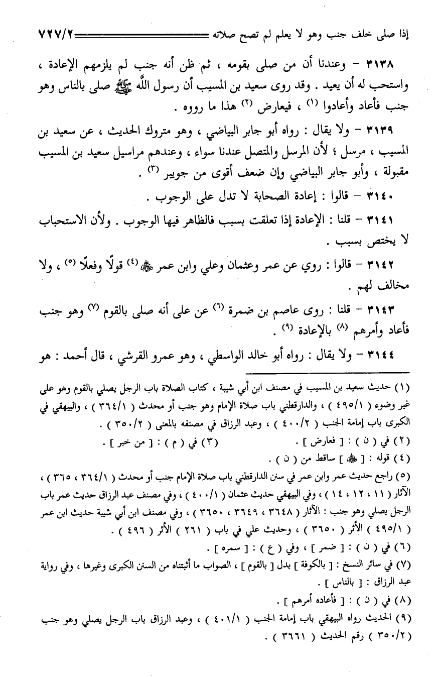 3143 - قلنا: روى عاصم بن ضمرة عن علي أنه صلى بالقوم وهو جنب فأعاد وأمرهم بالإعادة.