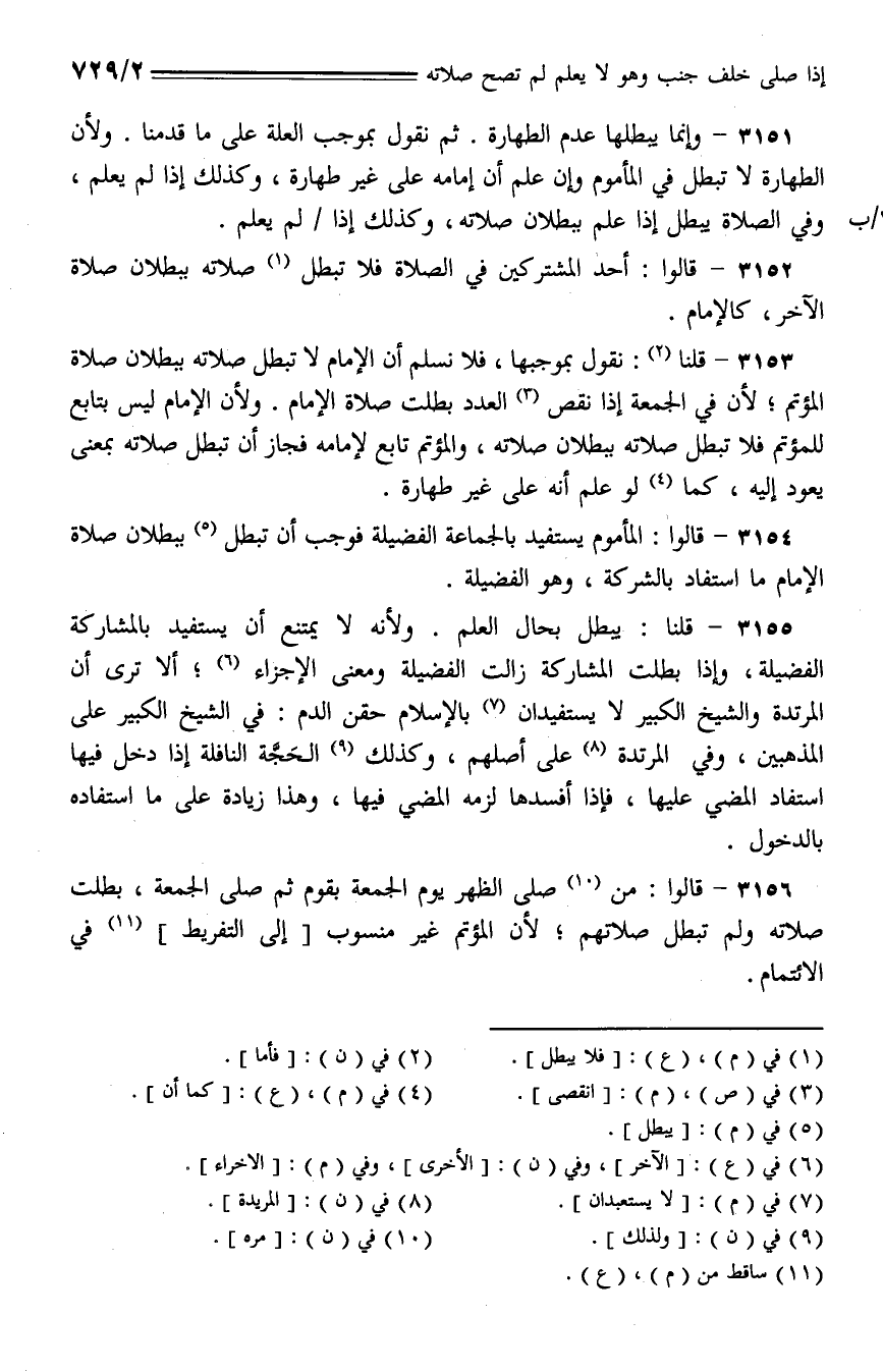 3151 - وإنما يبطلها عدم الطهارة. ثم نقول بموجب العلة على ما قدمنا. ولأن الطهارة لا تبطل غي المأموم وإن علم أن إمامه على غير طهارة، وكذلك إذا لم يعلم، وفي الصلاة يبطل إذا علم ببطلان صلاته، وكذلك إذا/ لم يعلم.