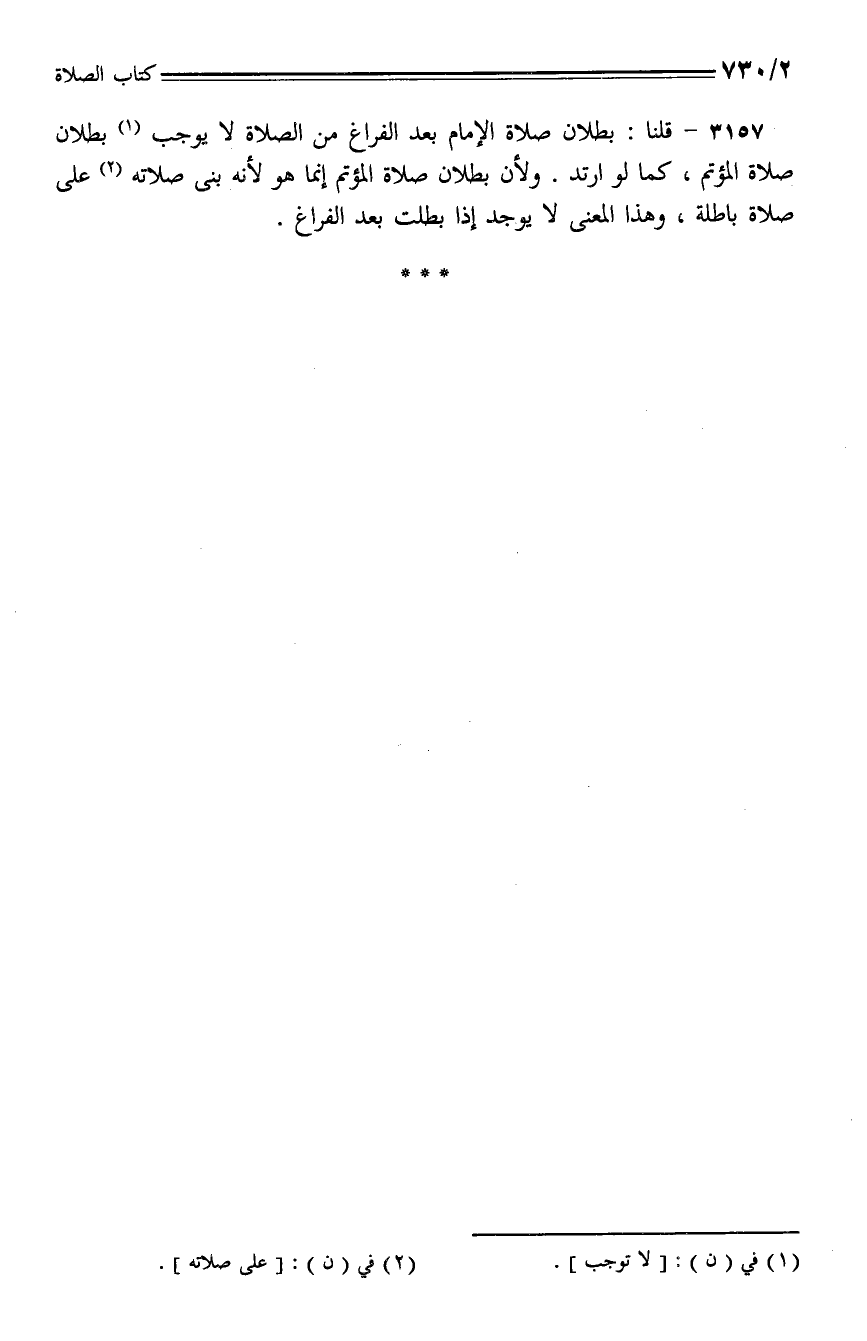 3157 - قلنا: بطلان صلاة الإمام بعد الفراغ من الصلاة لا يوجب بطلان صلاة المؤتم، كما لو ارتد. ولأن بطلان صلاة المؤتم إنما هو لأنه بنى صلاته على صلاة باطلة، وهذا المعنى لا يوجد إذا بطلت بعد الفراغ.