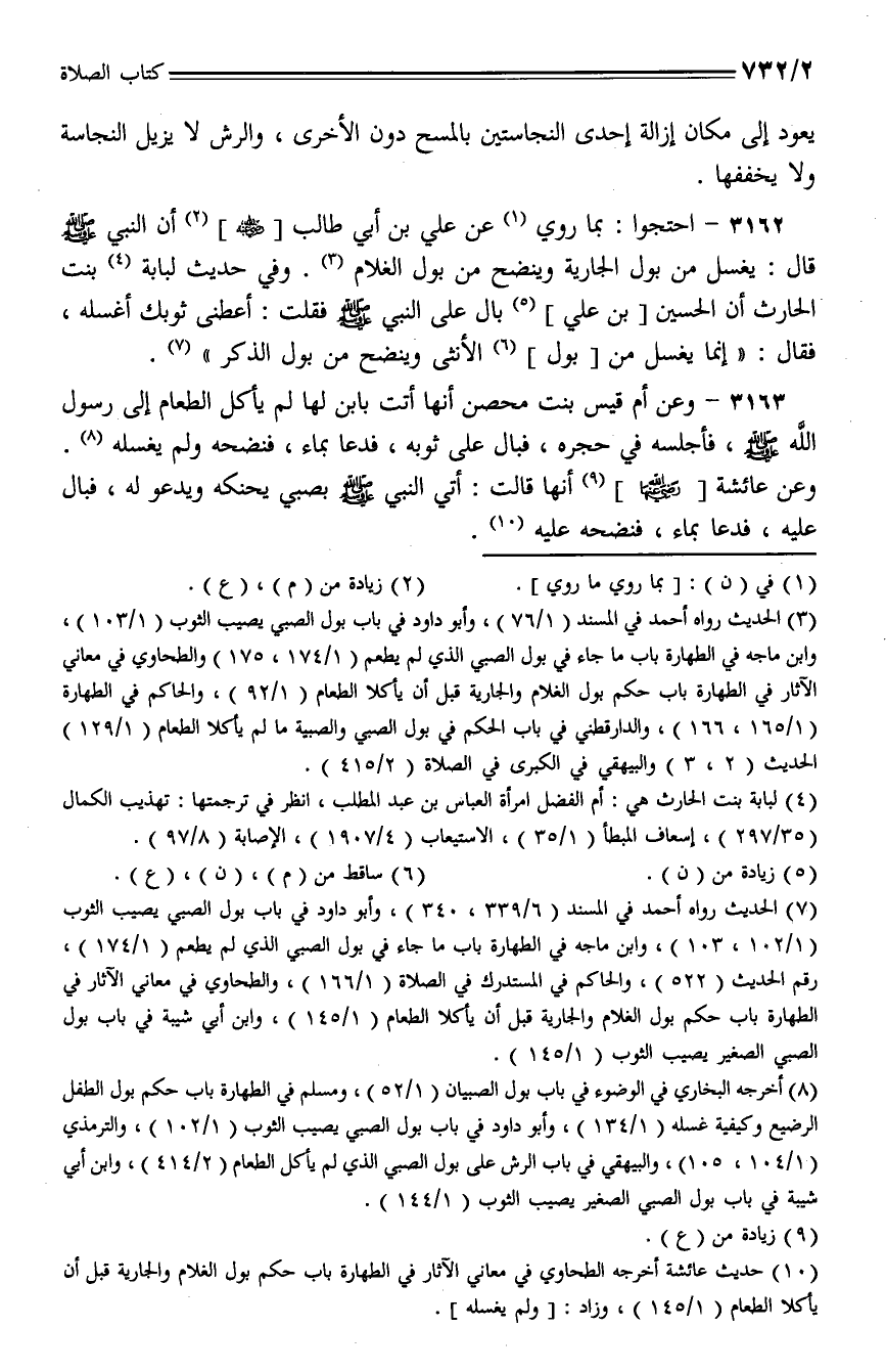 3162 - احتجوا: بما روي عن علي بن أبي طالب [- رضي الله عنهم -] أن النبي - صلى الله عليه وسلم - قال: يغسل من بول الجارية وينضح من بول الغلام. وفي حديث لبابة بنت الحارث أن الحسين [بن علي] بال على النبي - صلى الله عليه وسلم - فقلت: أعطني ثوبك أغسله، فقال: "إنما يغسل من [بول] الأنثى وينضح من بول الذكر".