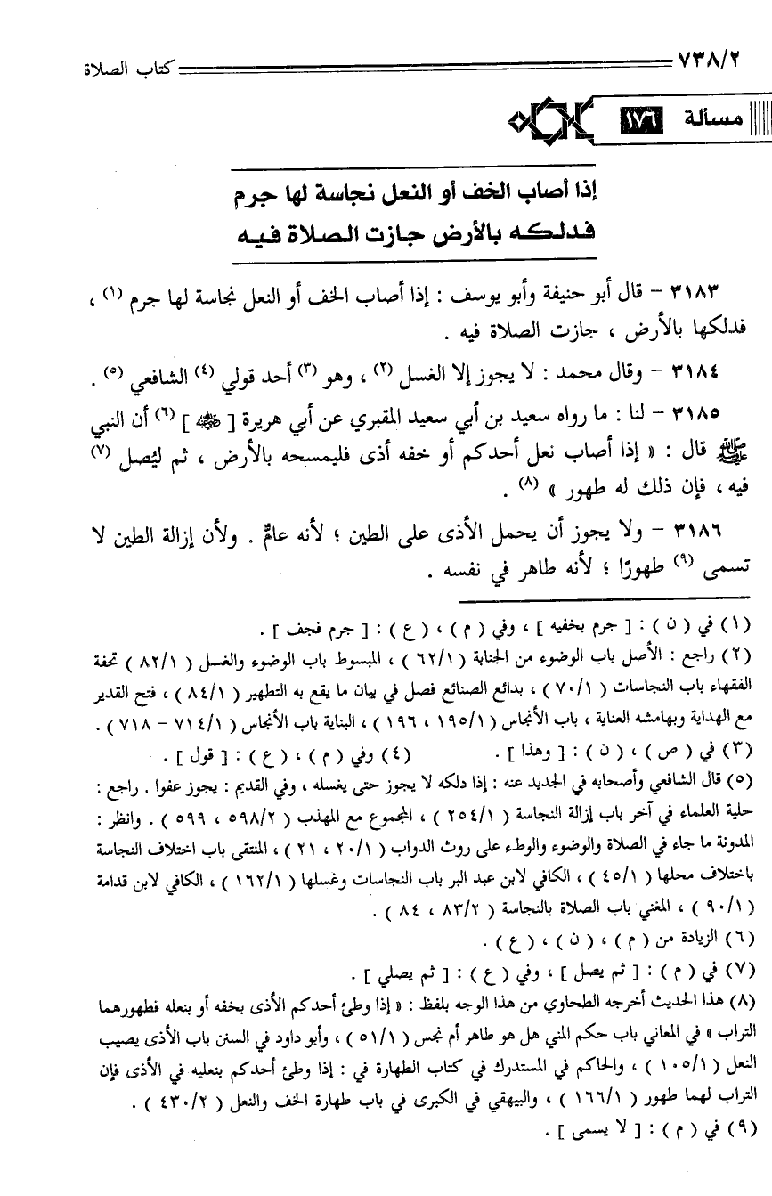3183 - قال أبو حنيفة وأبو يوسف: إذا أصاب الخف أو النعل نجاسة لها جرم، فدلكها بالأرض، جازت الصلاة فيه.