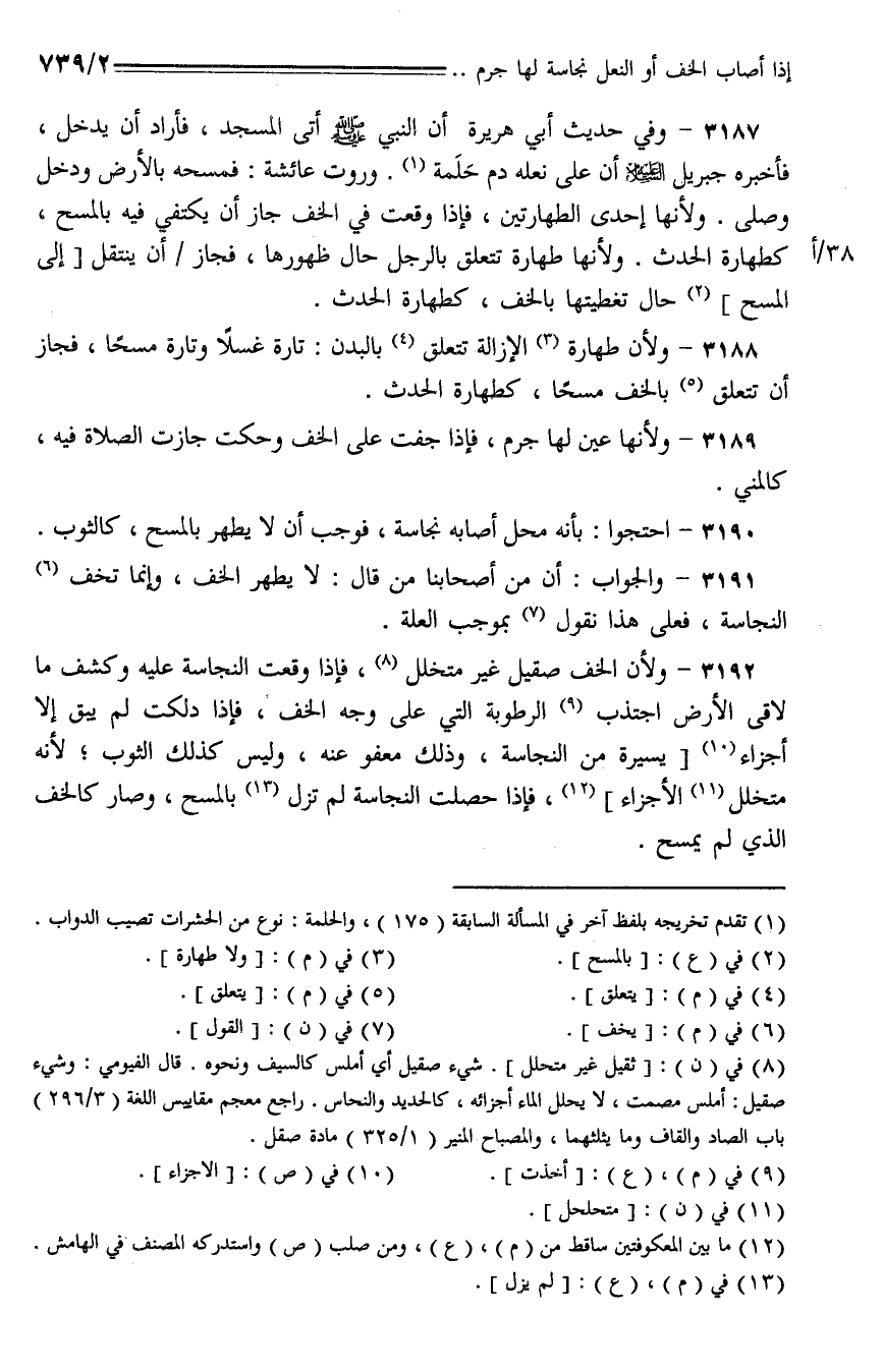3191 - والجواب: أن من أصحابنا من قال: لا يطهر الخف، وإنما تخف النجاسة، فعلى هذا نقول بموجب العلة.