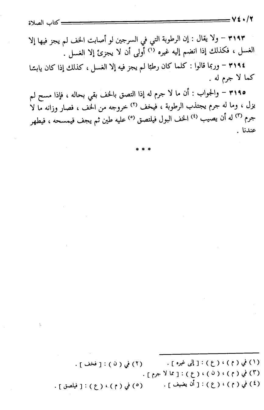 3193 - ولا يقال: إن الرطوبة التي في السرجين لو أصابت الخف لم يجز فيها إلا الغسل، فكذلك إذا انضم إليه غيره أولى أن لا يجزئ إلا الغسل.