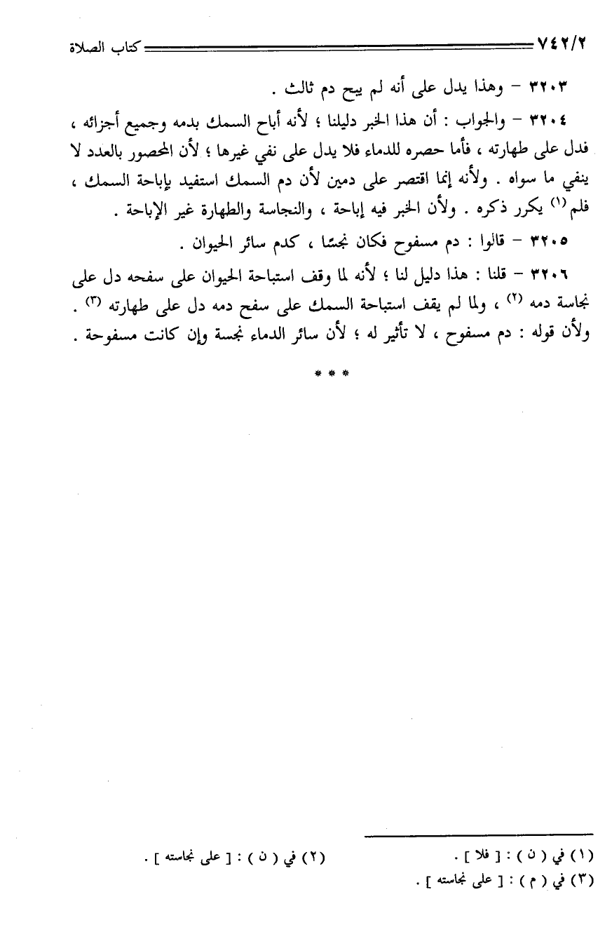 3205 - قالوا: دم مسفوح فكان نجسا، كدم سائر الحيوان.