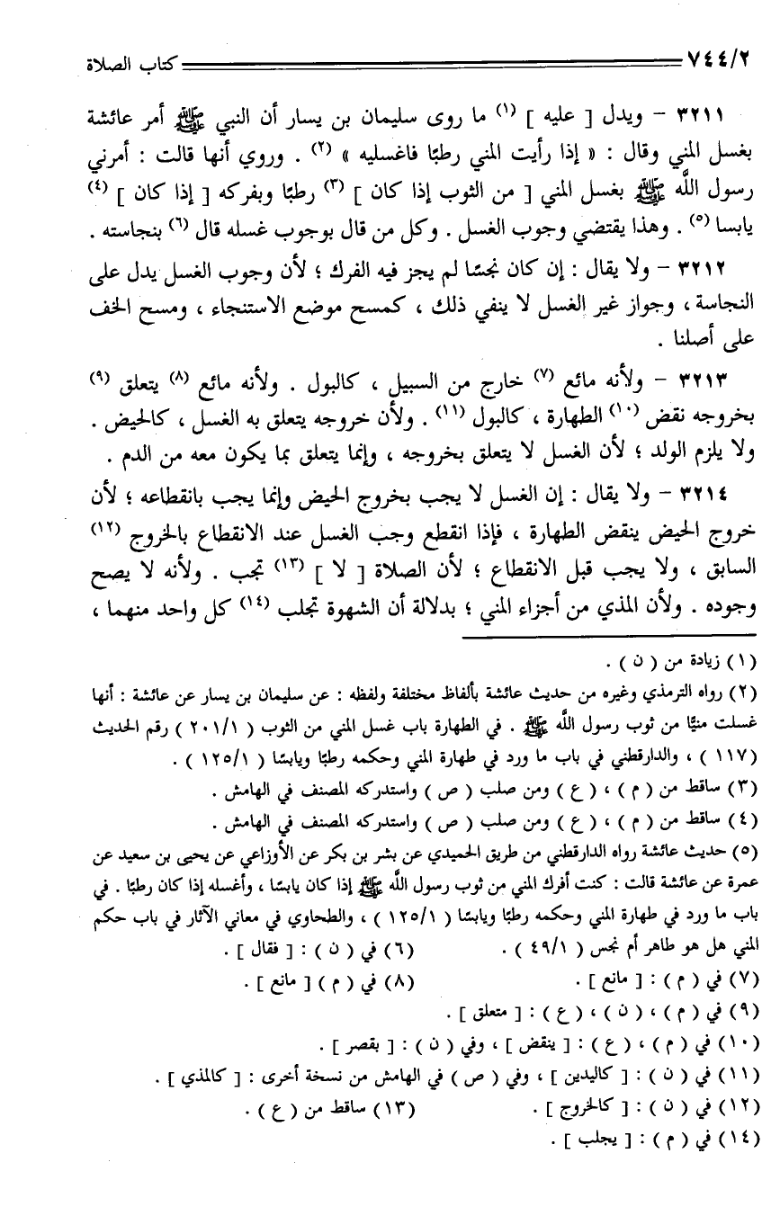 3211 - ويدل [عليه] ما روى سليمان بن يسار أن النبي - صلى الله عليه وسلم - أمر عائشة بغسل المني وقال: "إذا رأيت المني رطبا فاغسليه". وروي أنها قالت: أمرني رسول الله - صلى الله عليه وسلم - بغسل المني [من الثوب إذا كان] ركبا وبفركه [إذا كان] يابسا. وهذا يقتضي وجوب الغسل. وكل من قال بوجوب غسله قال بنجاسته.