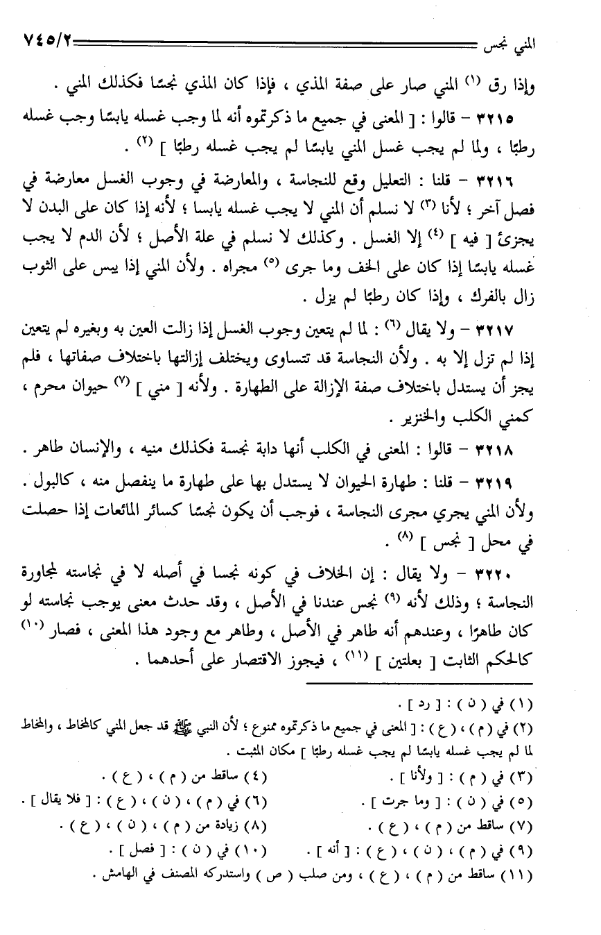 3219 - قلنا: طهارة الحيوان لا يستدل بها على طهارة ما ينفصل منه، كالبول. ولأن المني يجري مجرى النجاسة، فوجب أن يكون نجسا كسائر المائعات إذا حصلت في محل [نجس].