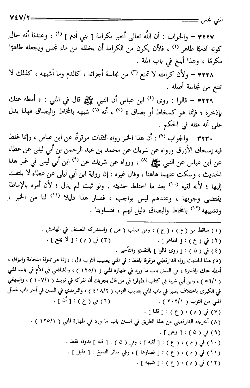 3227 - والجواب: أن الله تعالى أخبر بكرامة [بني آدم]، وعندنا أنه حال كونه آدميا طاهر، فلأن يكون من الكرامة أن يخلقه من ماء نجس ويجعله طاهرا مكرما، وهذا أبلغ في باب المنة.