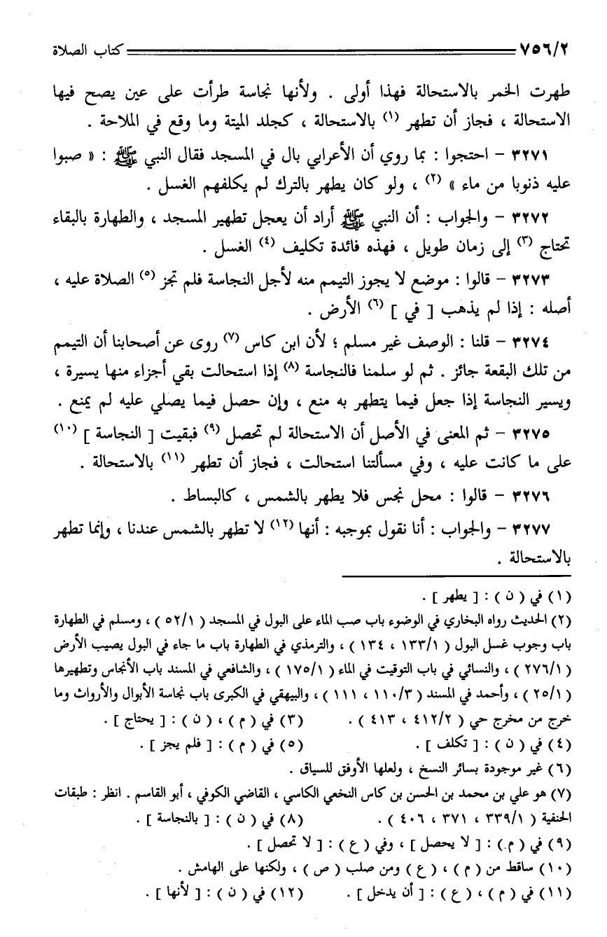 3277 - والجواب: أنا نقول بموجبه: أنها لا تطهر بالشمس عندنا، وإنما تطهر بالاستحالة.