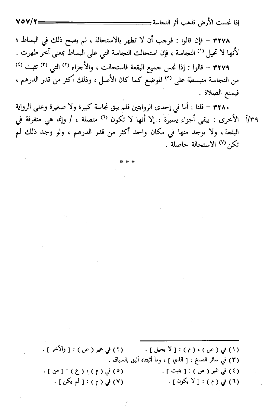 3280 - قلنا: أما في إحدى الروايتين فلم يبق نجاسة كبيرة ولا صغيرة وعلى الرواية الأخرى: يبقى أجزاء يسيرة، إلا أنها لا تكون متصلة،/ وإنما هي متفرقة في البقعة، ولا يوجد منها في مكان واحد أكثر من قدر الدرهم، ولو وجد ذلك لم تكون الاستحالة حاصلة.