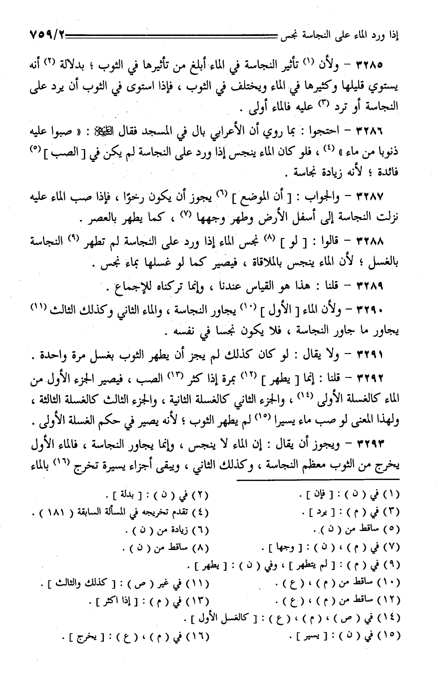 3293 - ويجوز أن يقال: إن الماء لا ينجس، وإنما يجاور النجاسة، فالماء الأول يخرج من الثوب معظم النجاسة، وكذلك الثاني، ويبقى أجزاء يسيرة تخرج بالماء